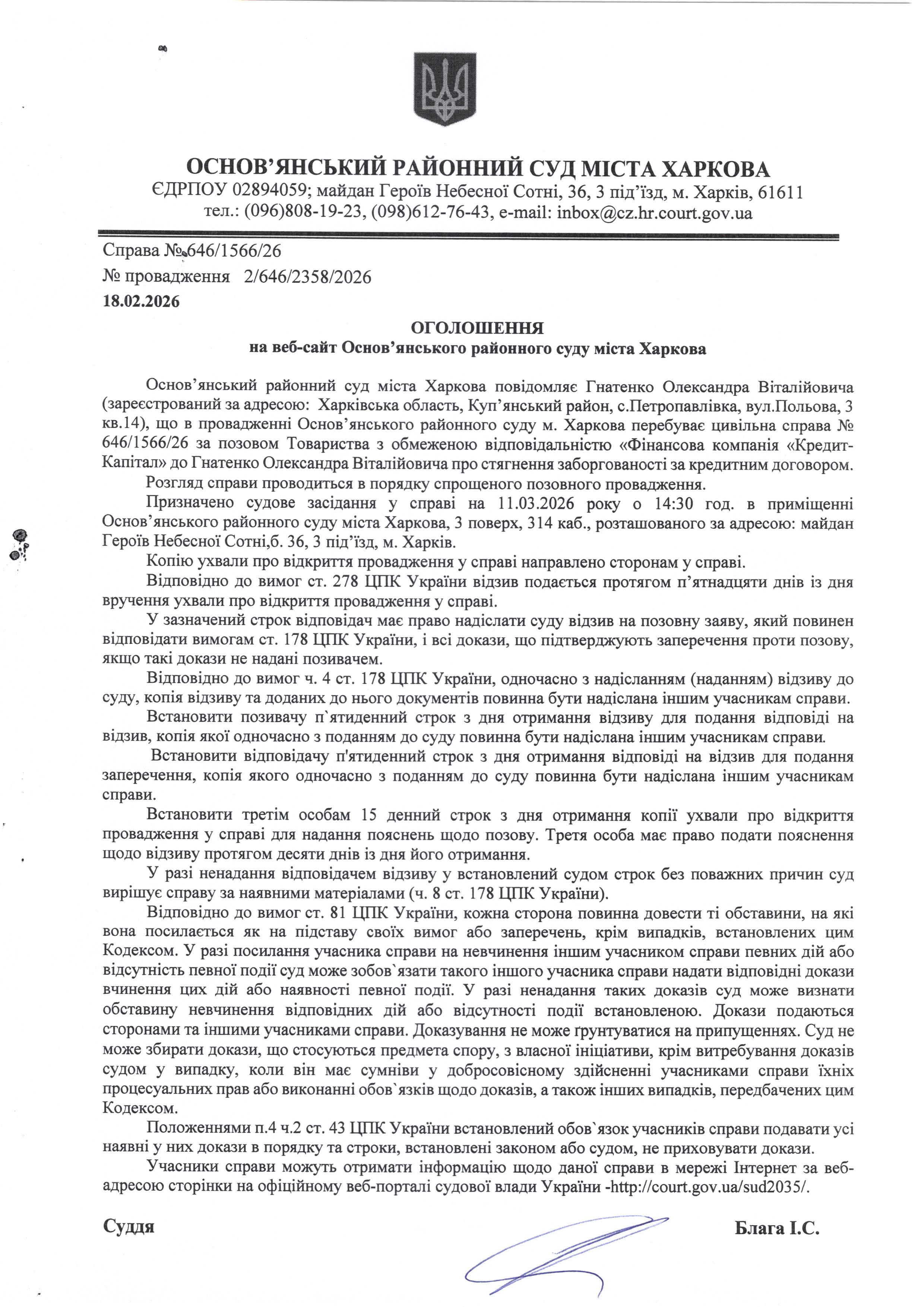 Оголошення по справі № 646/1566/26 для Гнатенка Олександра Віталійовича