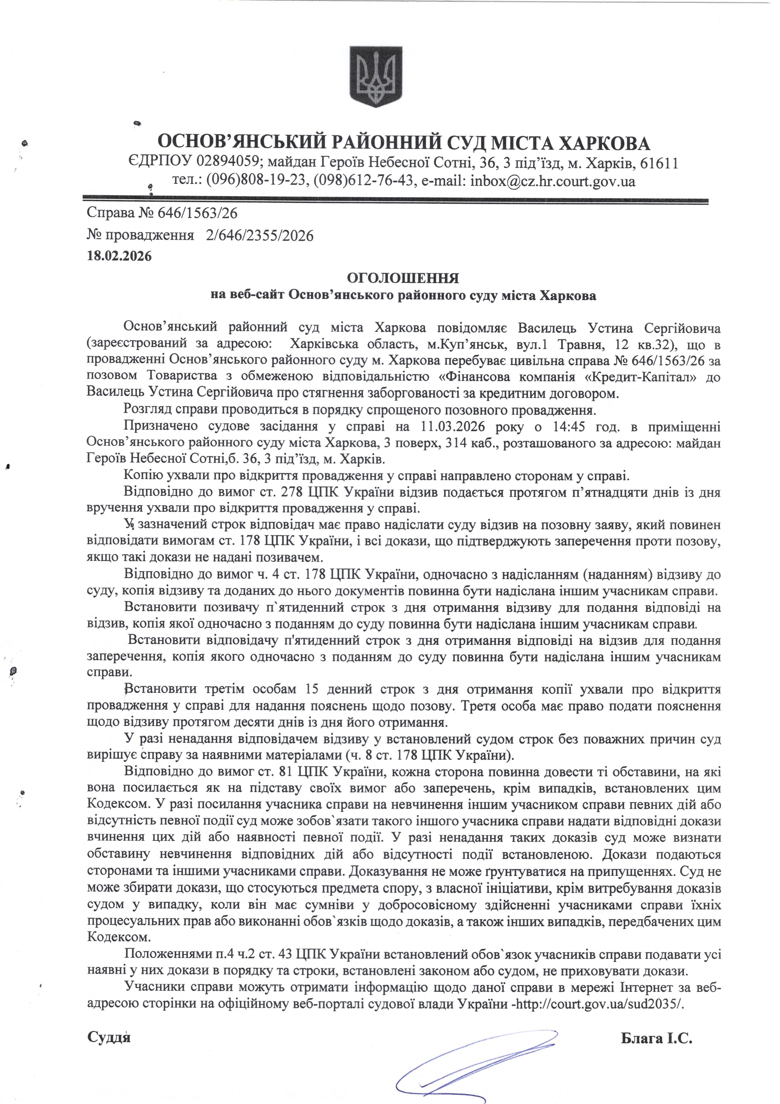 Оголошення по справі № 646/1563/26 для Василець Устина Сергійовича
