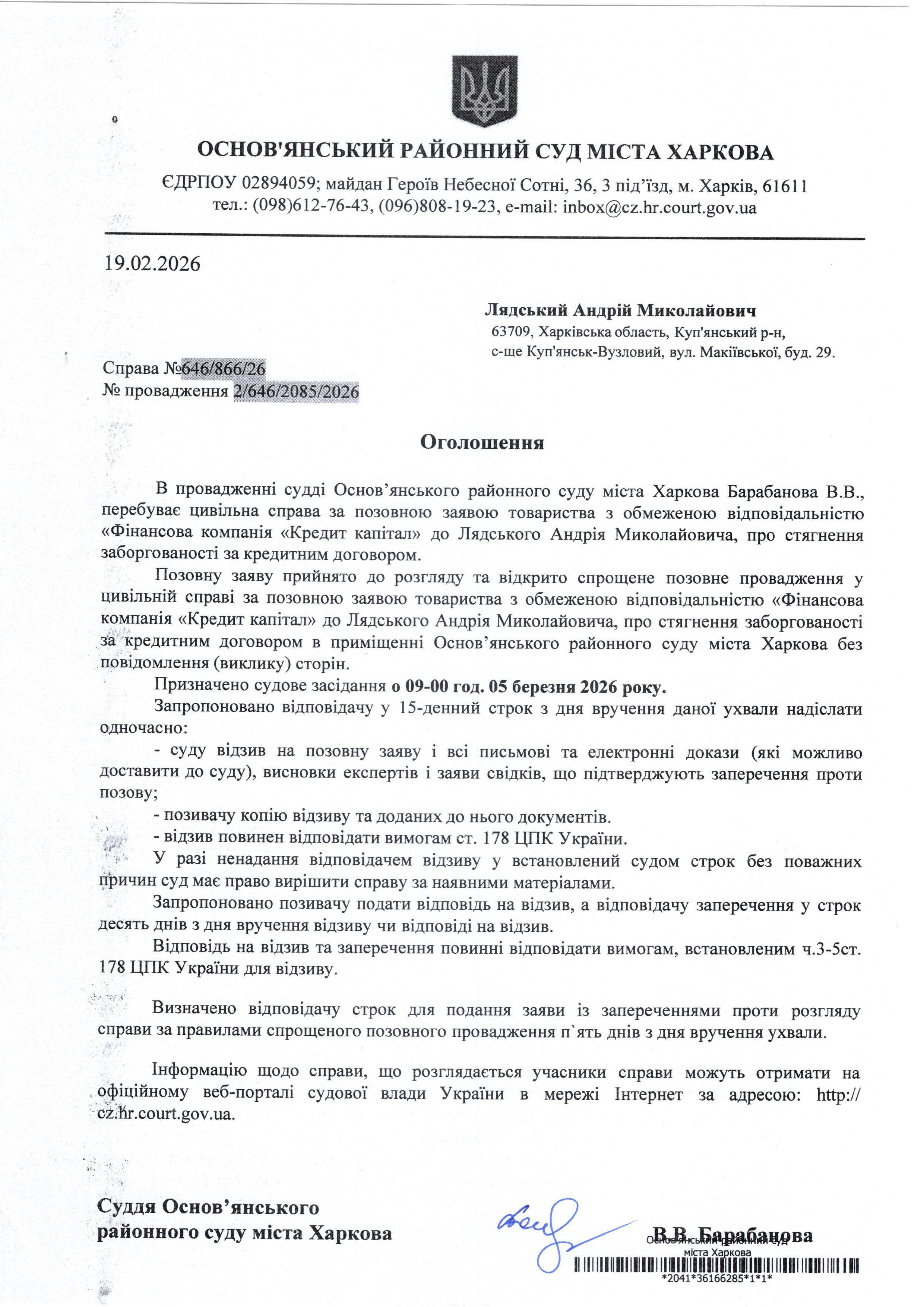 Оголошення по справі № 646/866/26 для Лядського Андрія Миколайовича