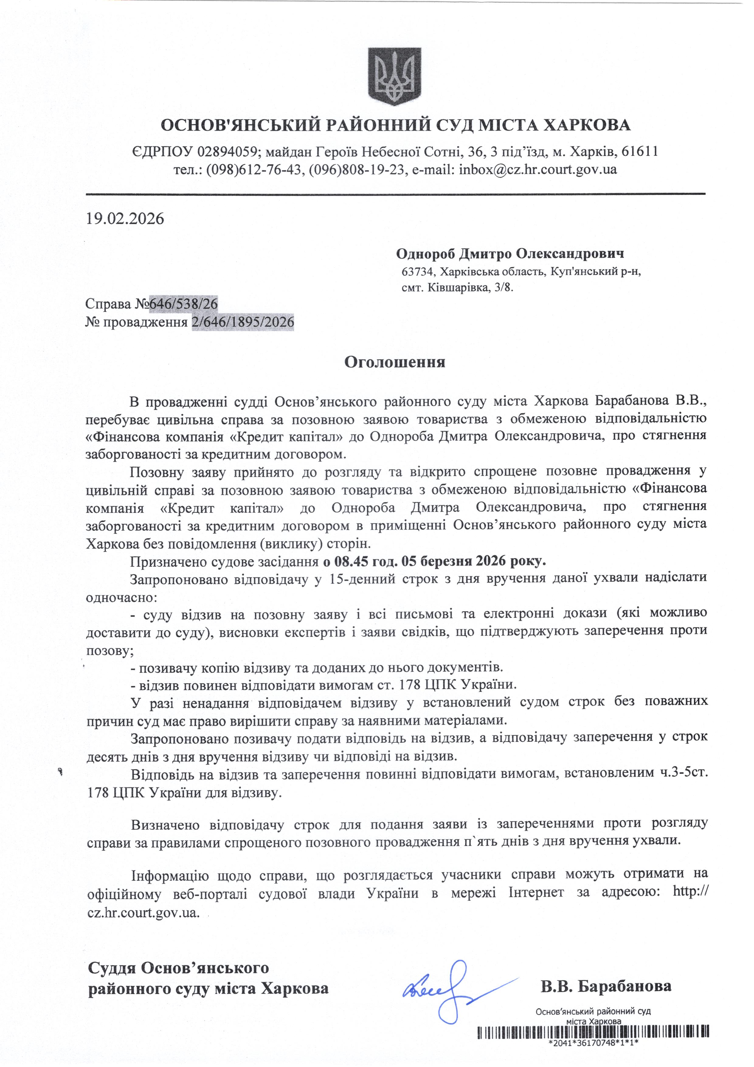 Оголошення по справі № 646/538/26 для Однороб Дмитра Олександровича