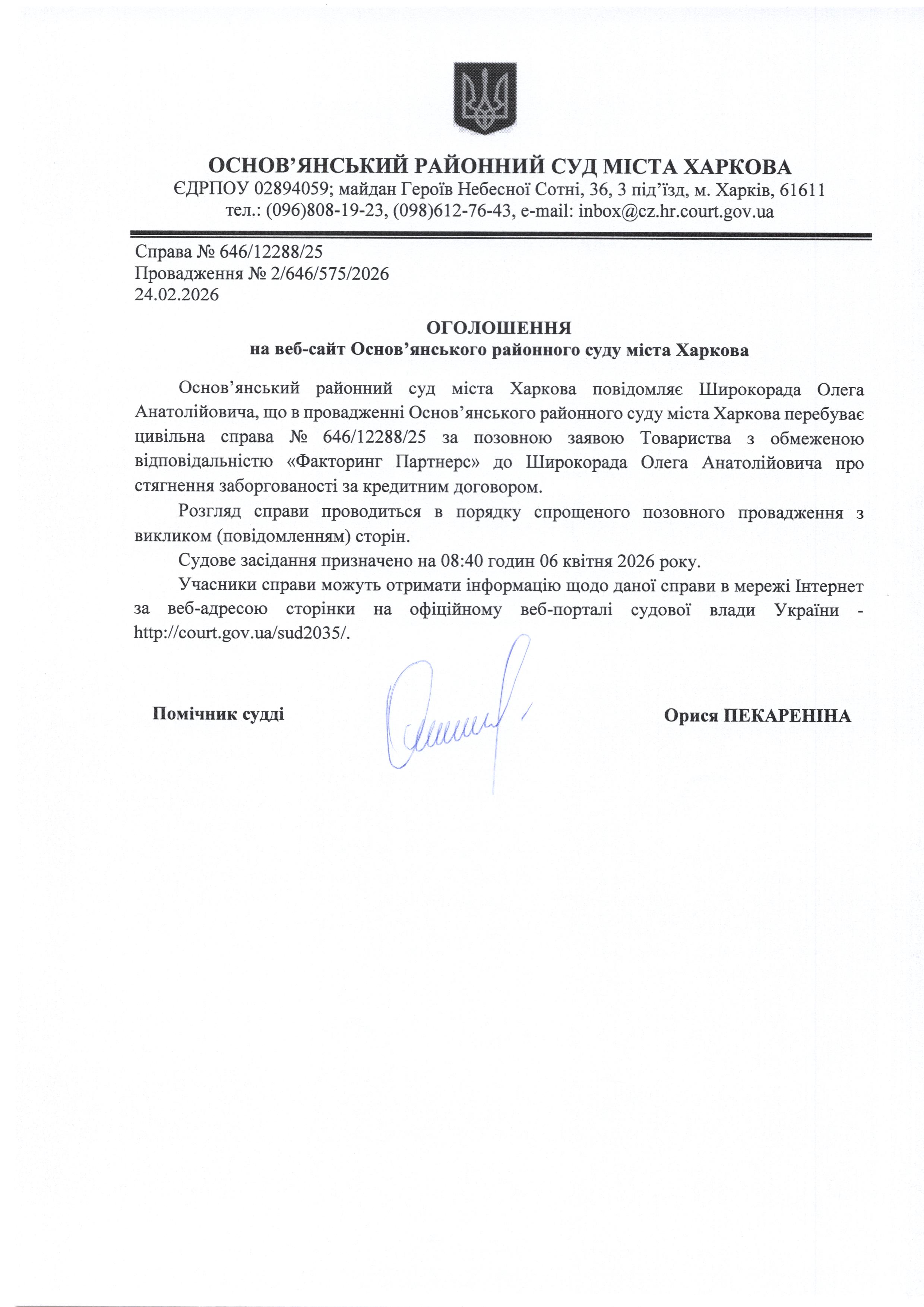 Оголошення по справі № 646/12288/25 для Широкорада Олега Анатолійовича