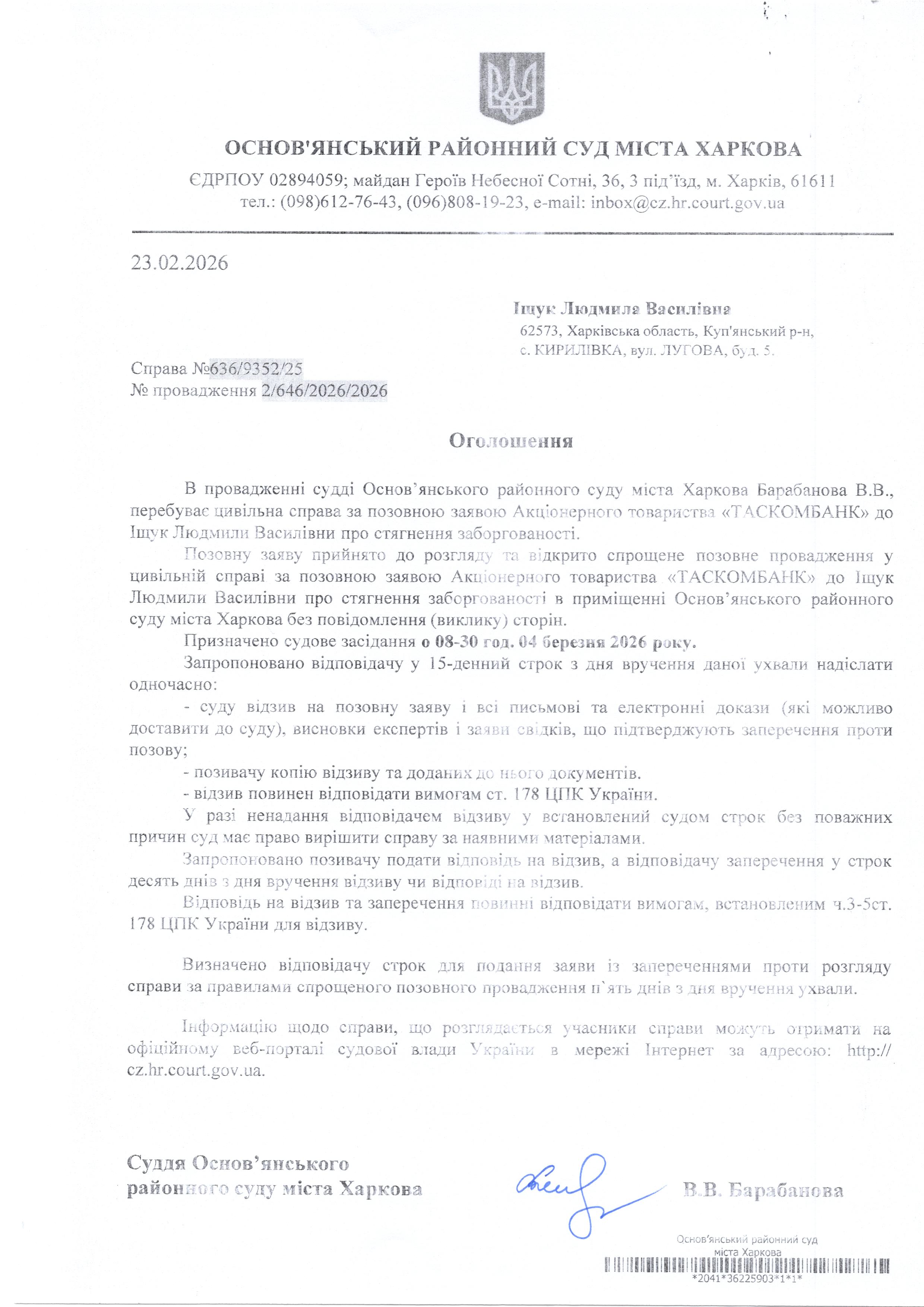 Оголошення по справі № 636/9352/25 для Іщук Людмили Василівни