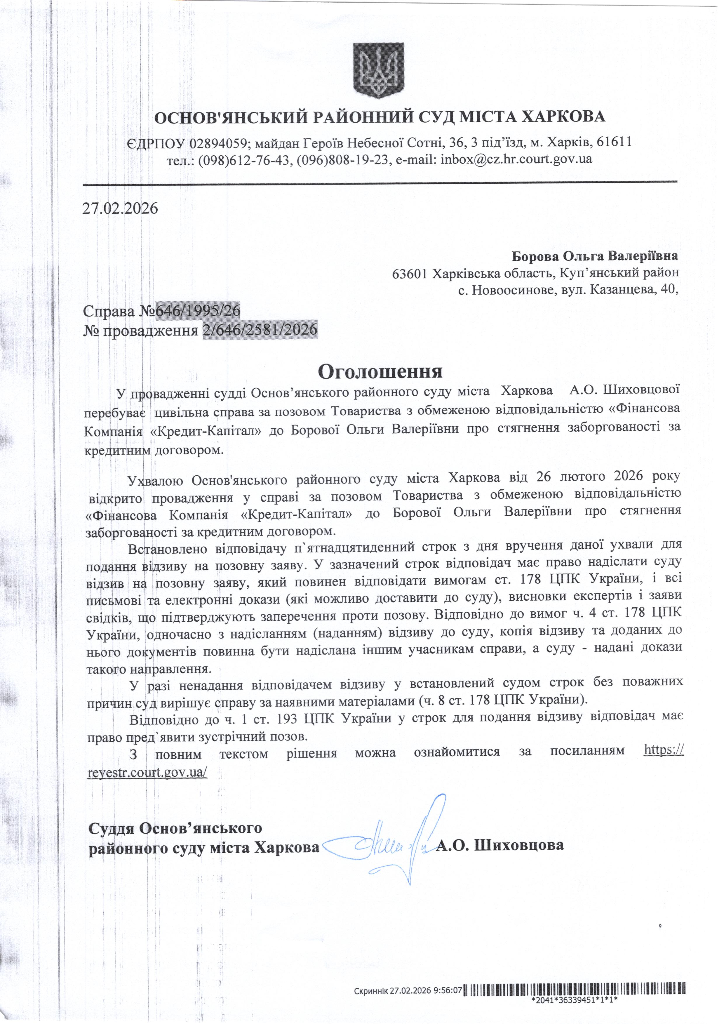 Оголошення по справі № 646/1995/26 для Борової Ольги Валеріївни