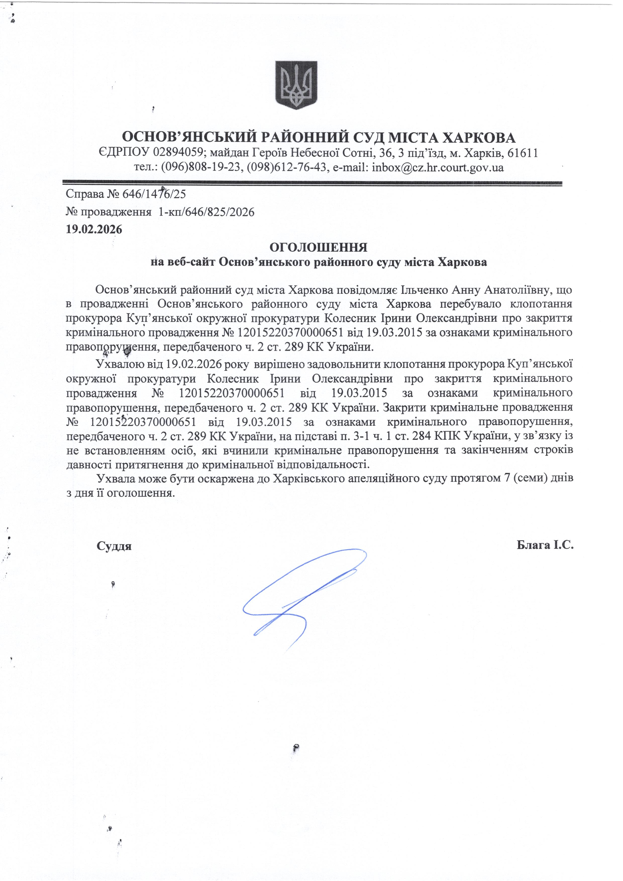 Оголошення по справі № 646/1476/25 для Ільченко Анни Анатоліївни
