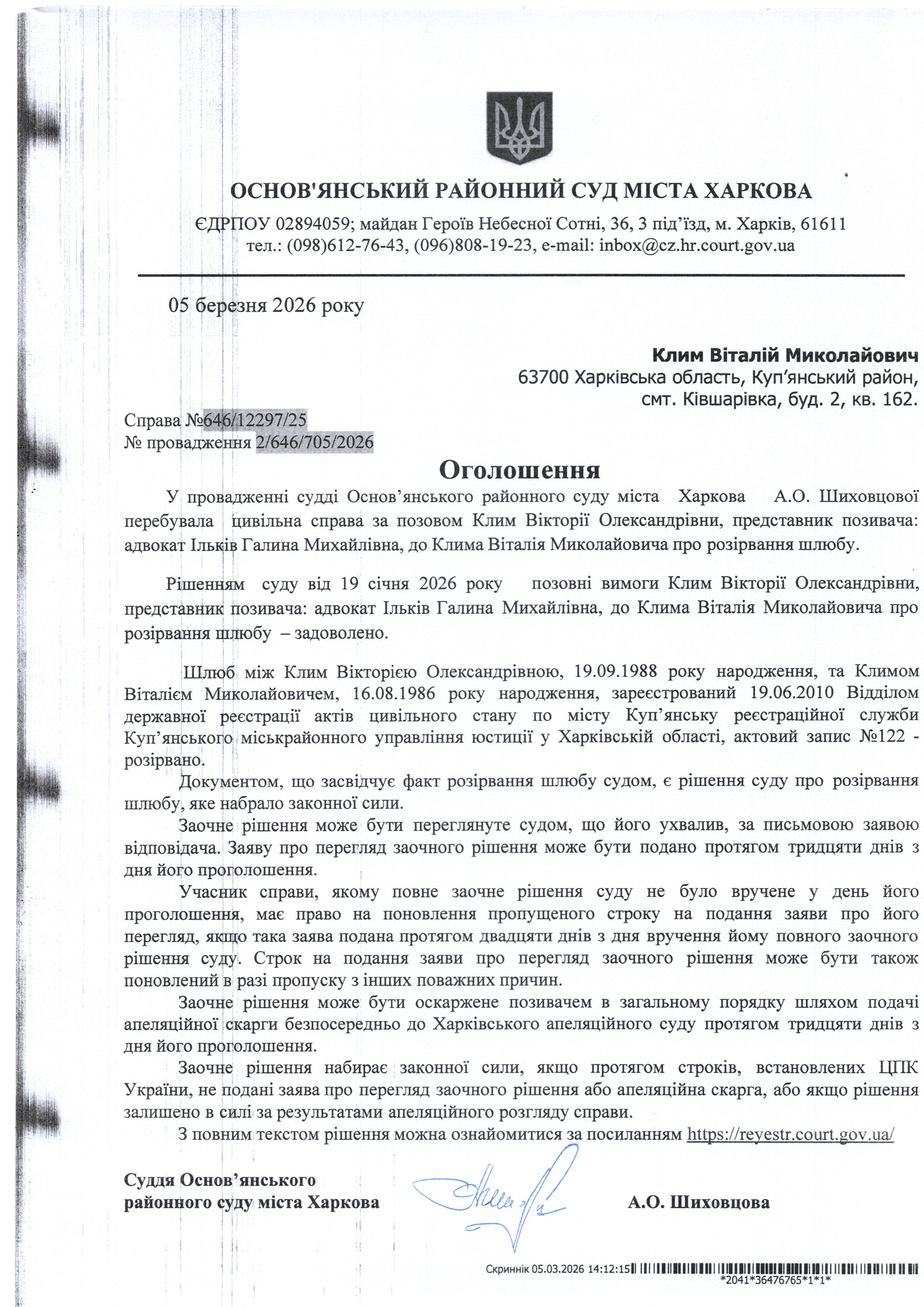 Оголошення по справі № 646/12297/25 для Клим Віталія Миколайовича