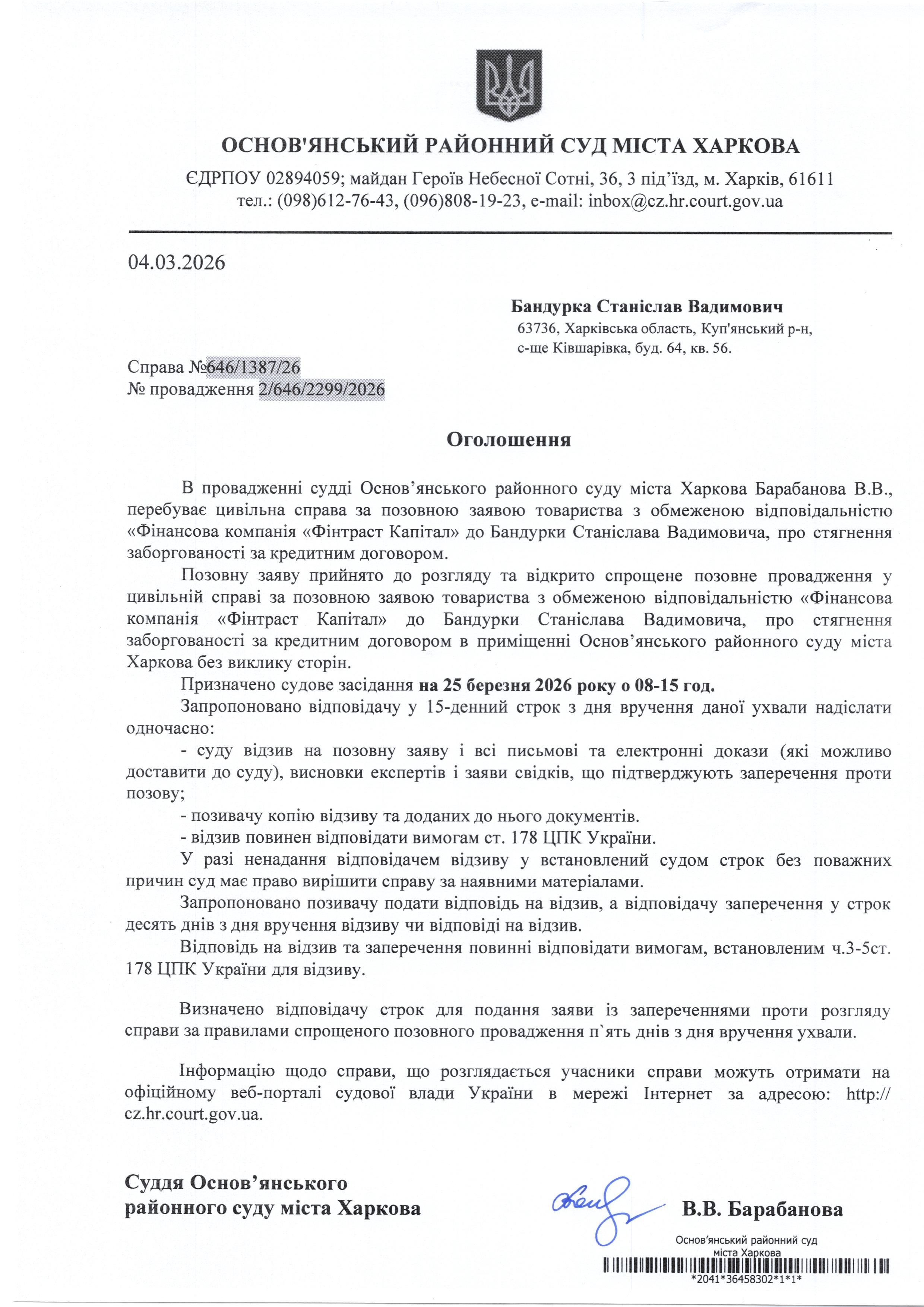 Оголошення по справі № 646/1387/26 для Бандурка Станіслава Вадимовича
