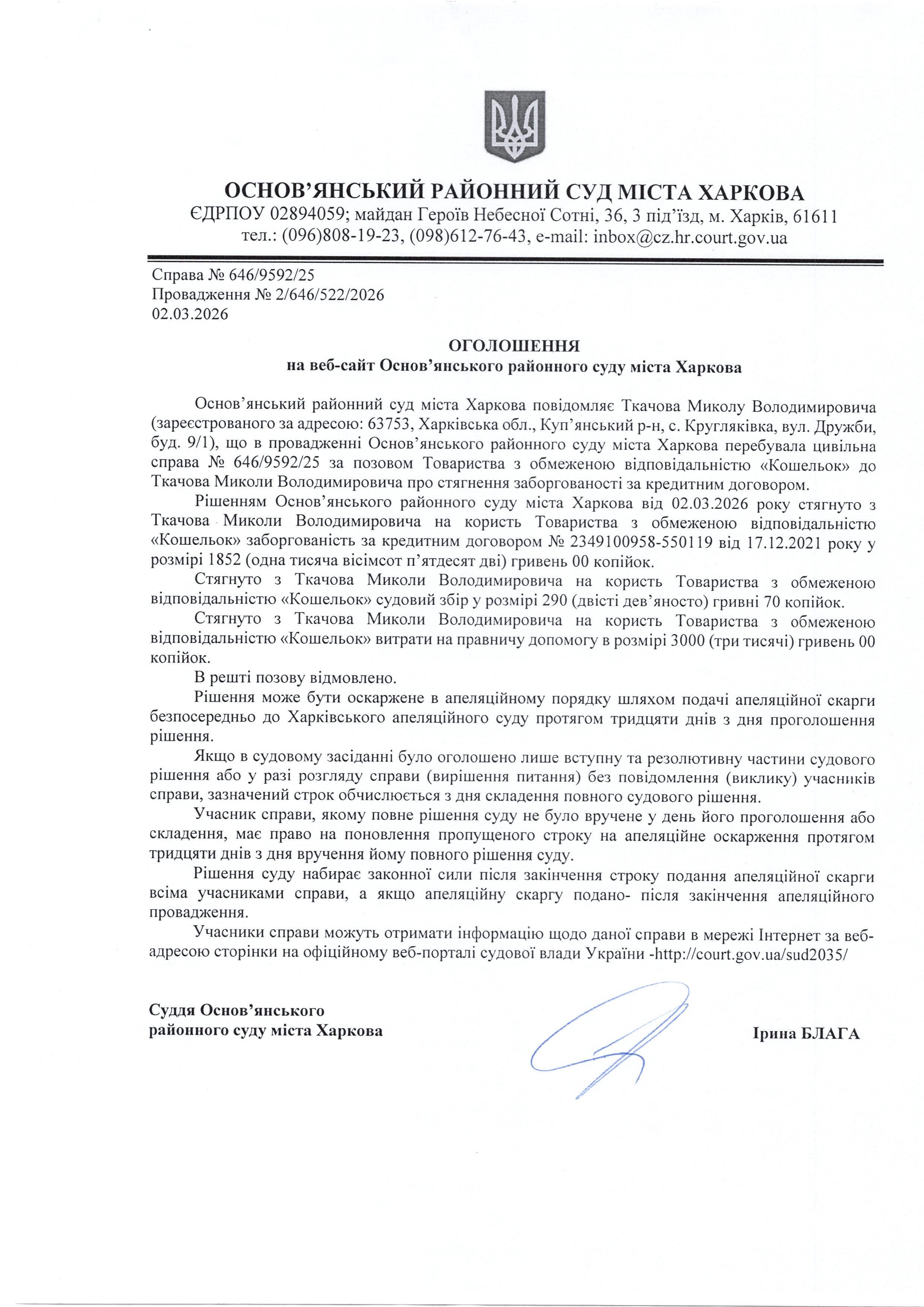 Оголошення по справі № 646/9592/25 для Ткачова Миколи Володимировича