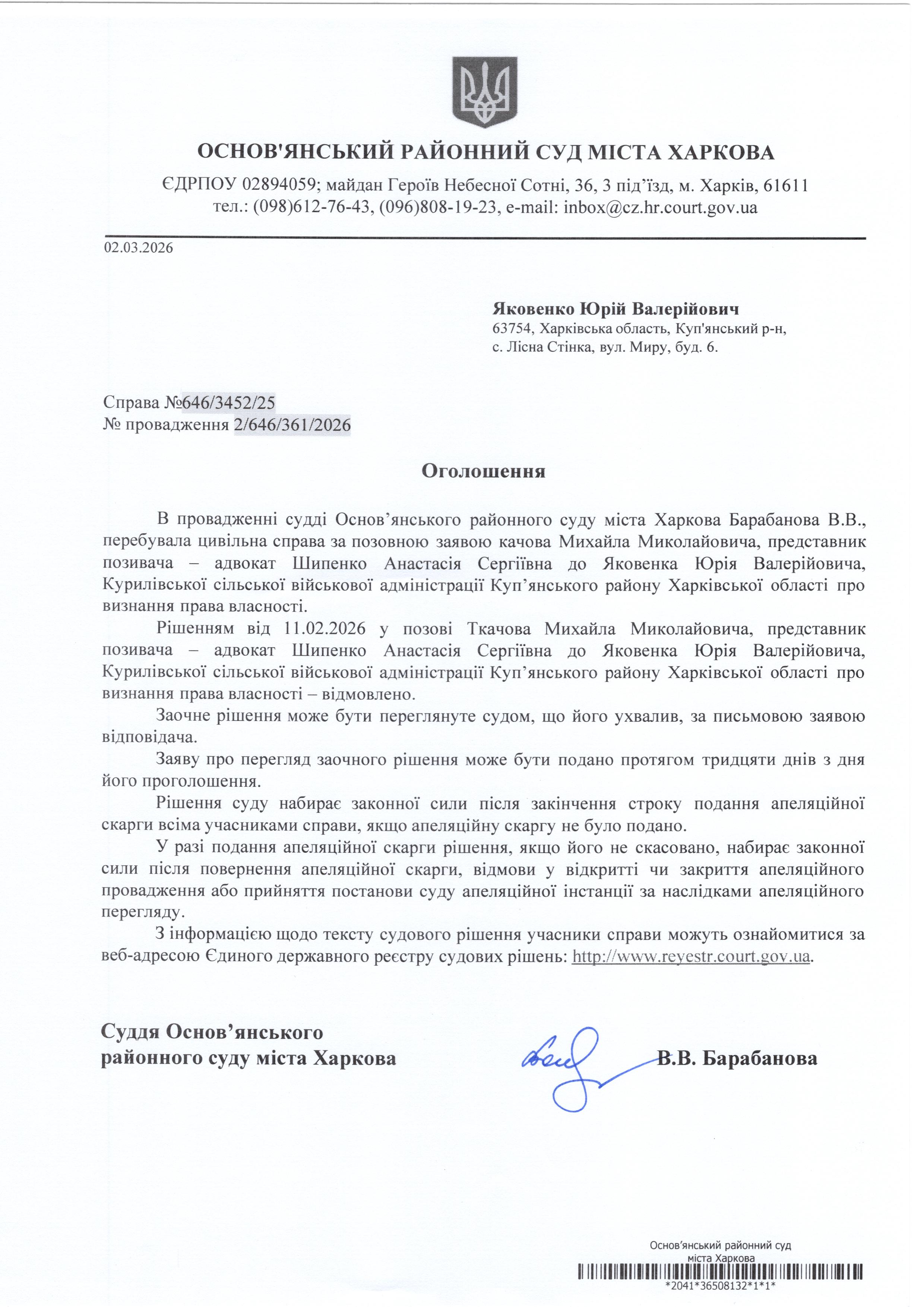 Оголошення по справі № 646/3452/25 для Яковенка Юрія Валерійовича