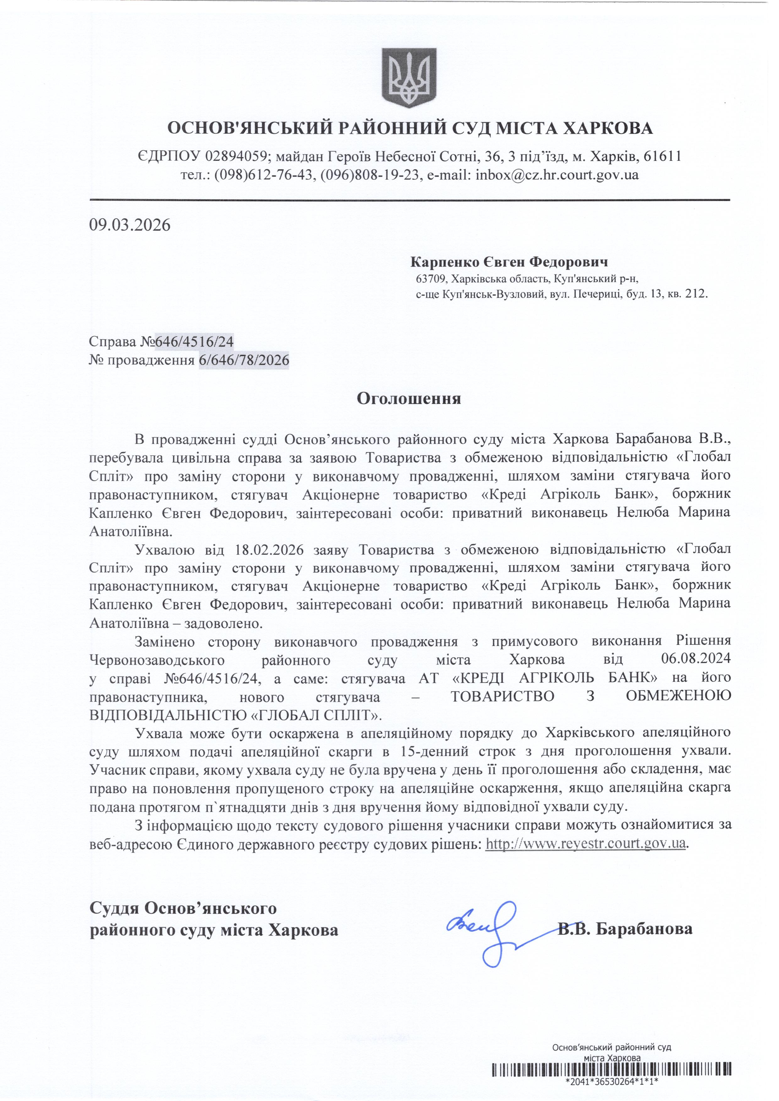 Оголошення по справі № 646/4516/24 для Карпенка Євгена Федоровича
