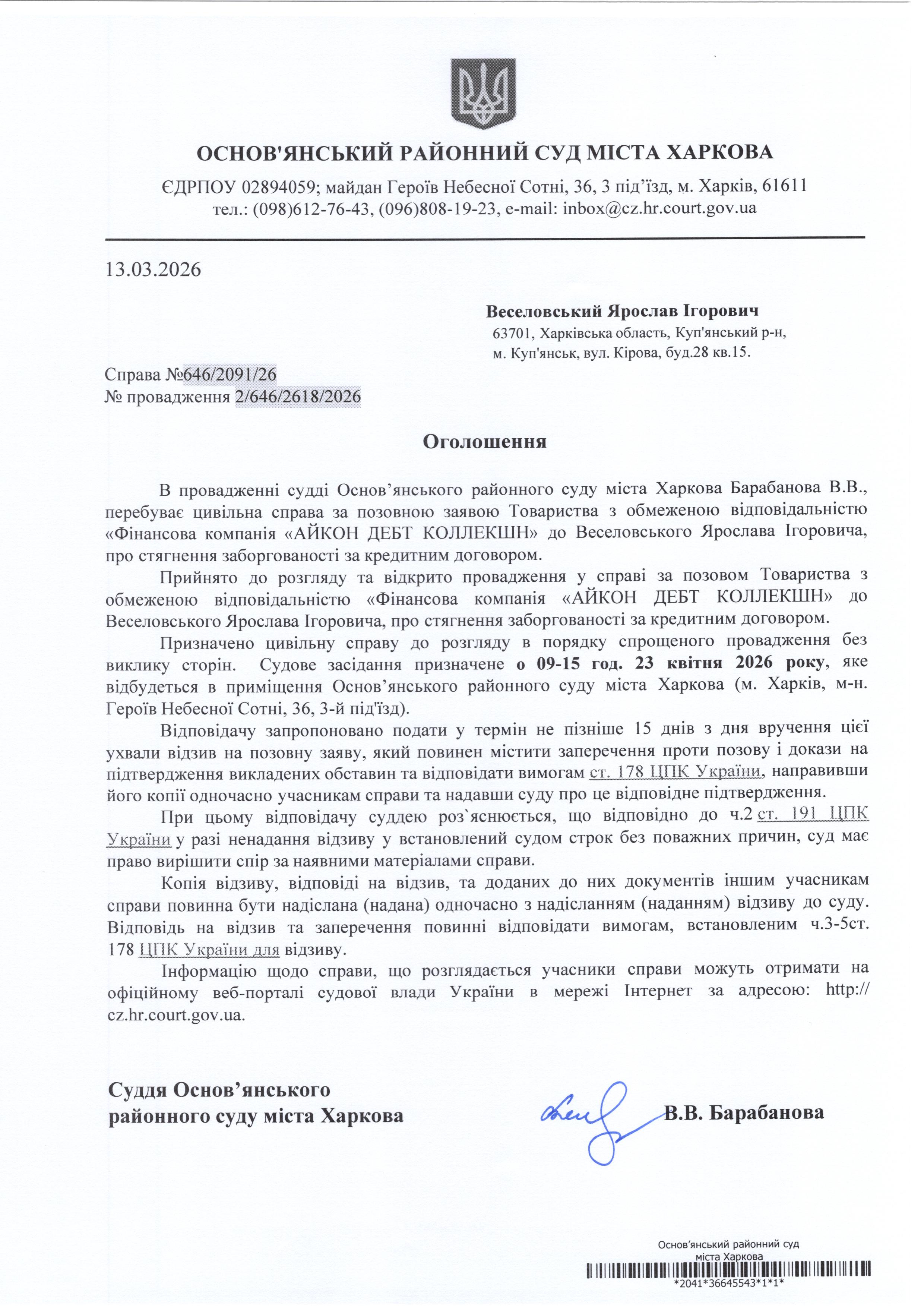 Оголошення по справі № 646/2091/26 для Веселовського Ярослава Ігоровича