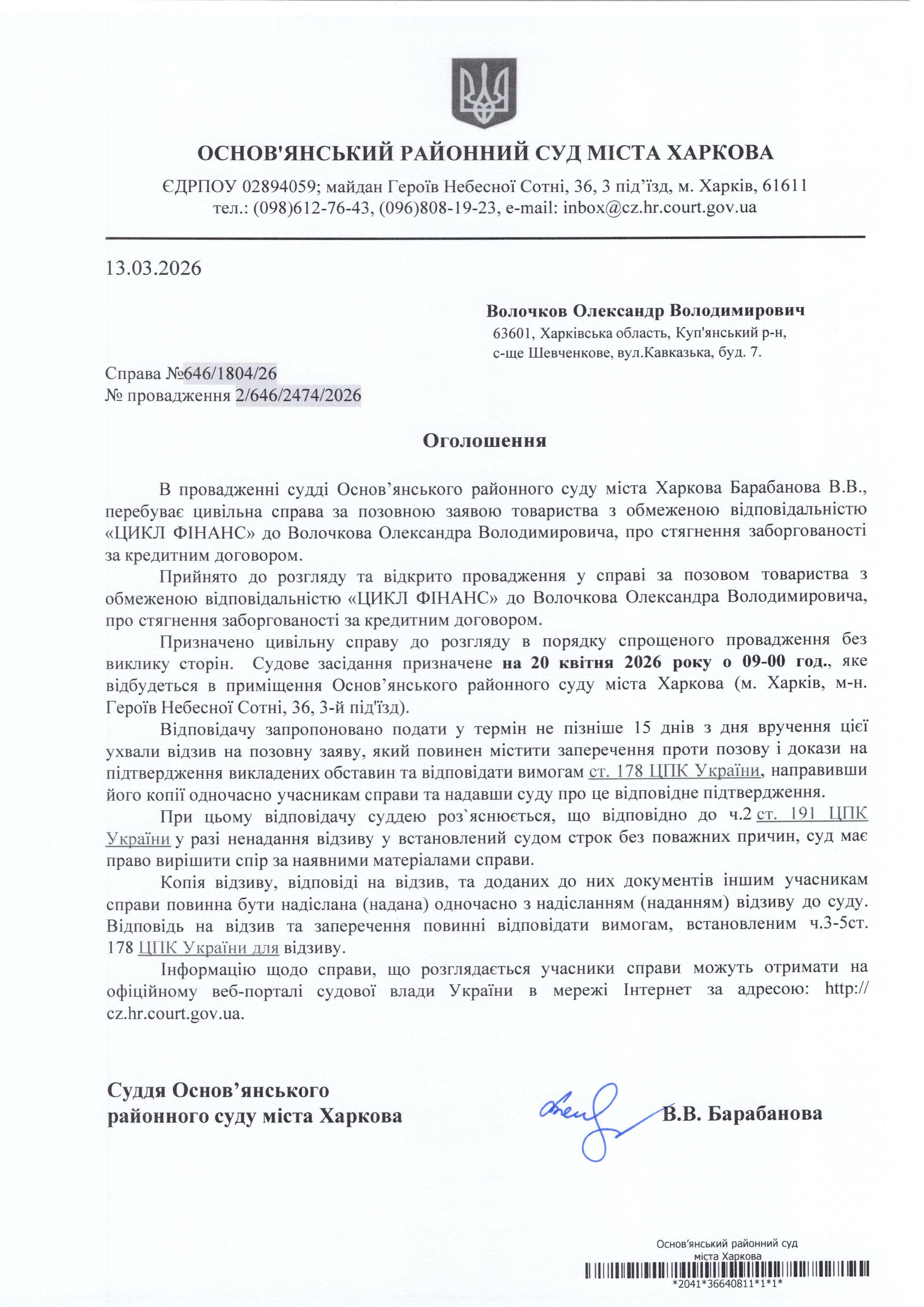 Оголошення по справі № 646/1804/26 для Волочкова Олександра Володимировича