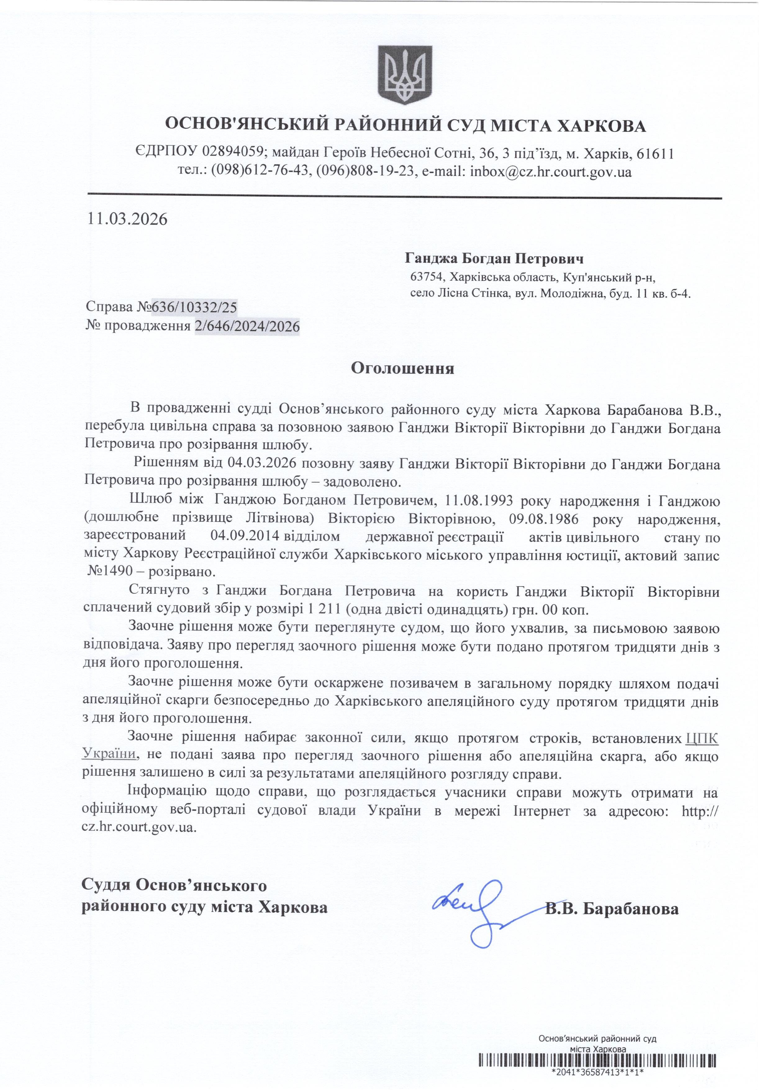 Оголошення по справі № 636/10332/25 для Ганджа Богдана Петровича