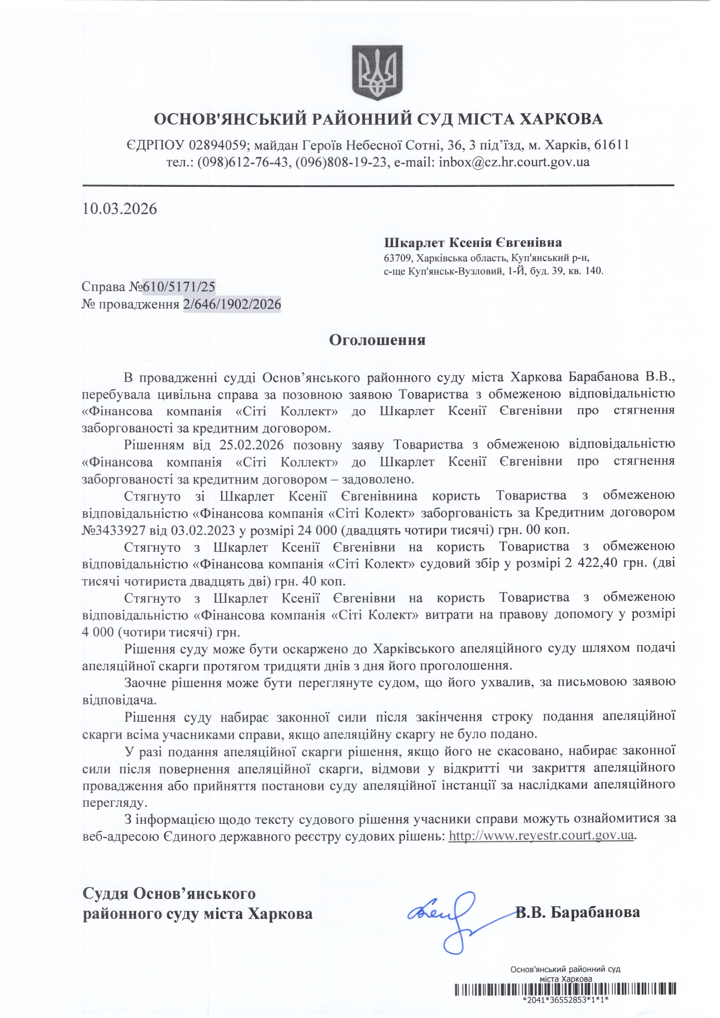 Оголошення по справі № 610/5171/25 для Шкарлет Ксенії Євгенівна