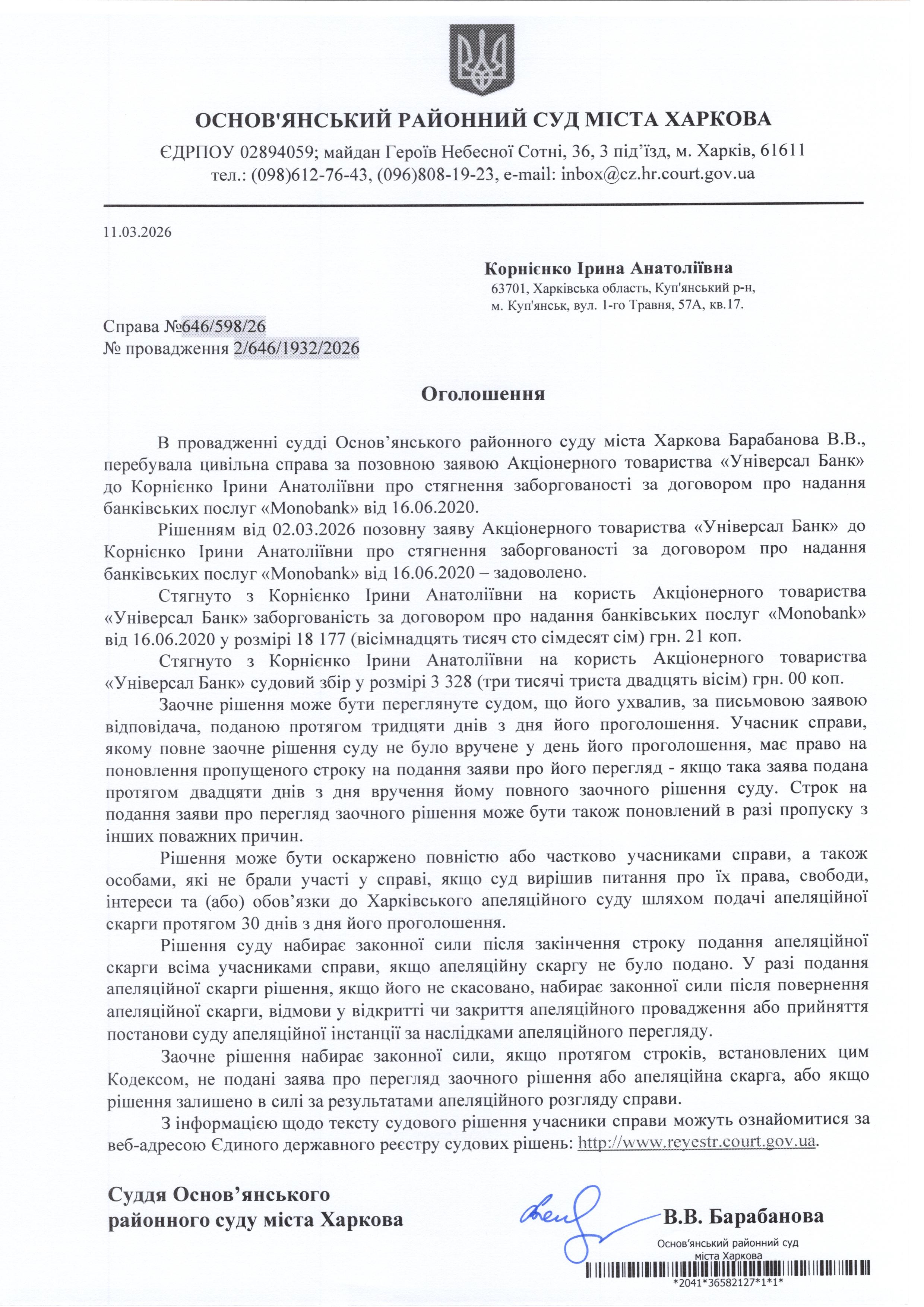 Оголошення по справі № 646/598/26 для Корнієнко Ірини Анатоліївни