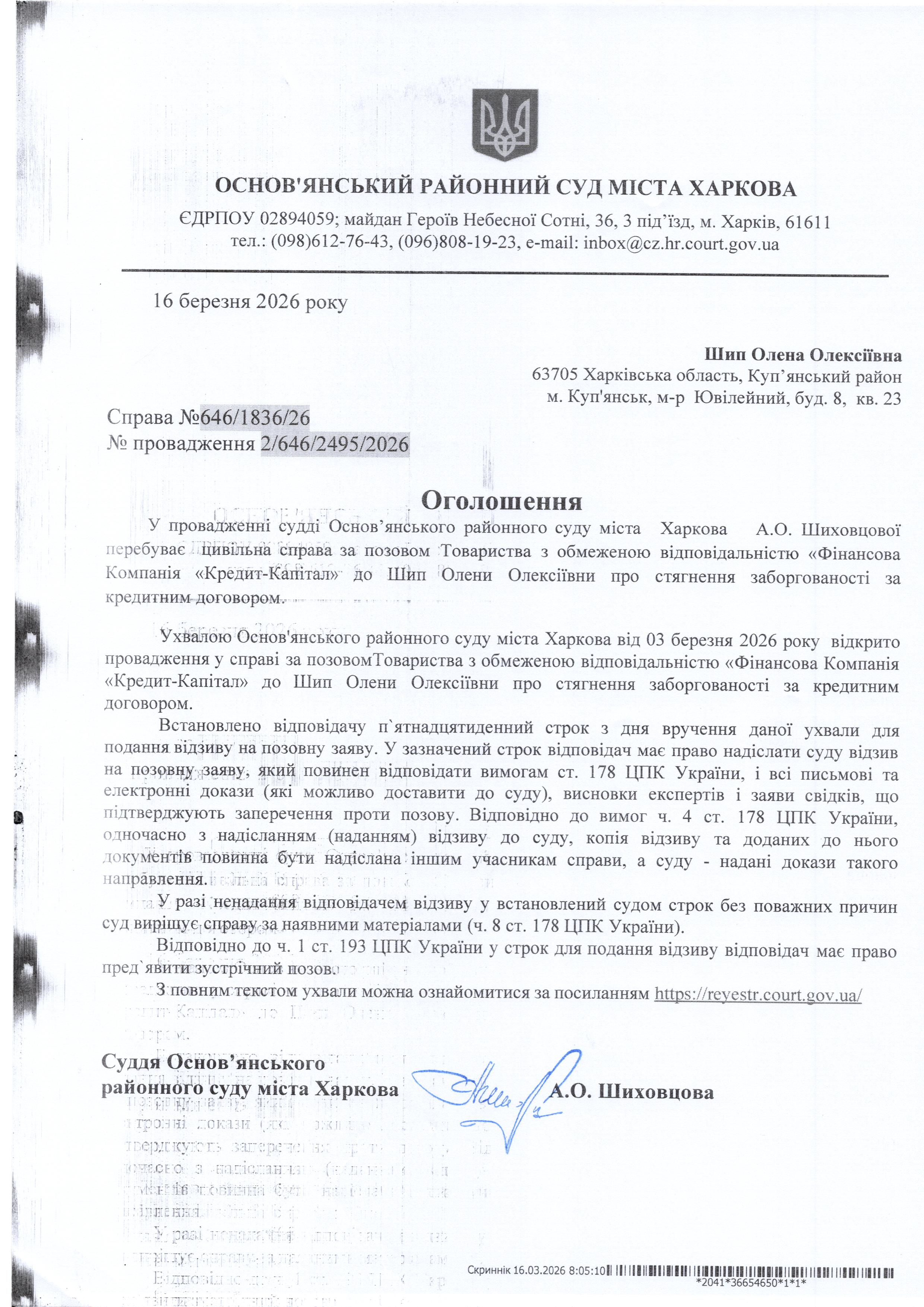 Оголошення по справі № 646/1836/26 для Шип Олени Олексіївни