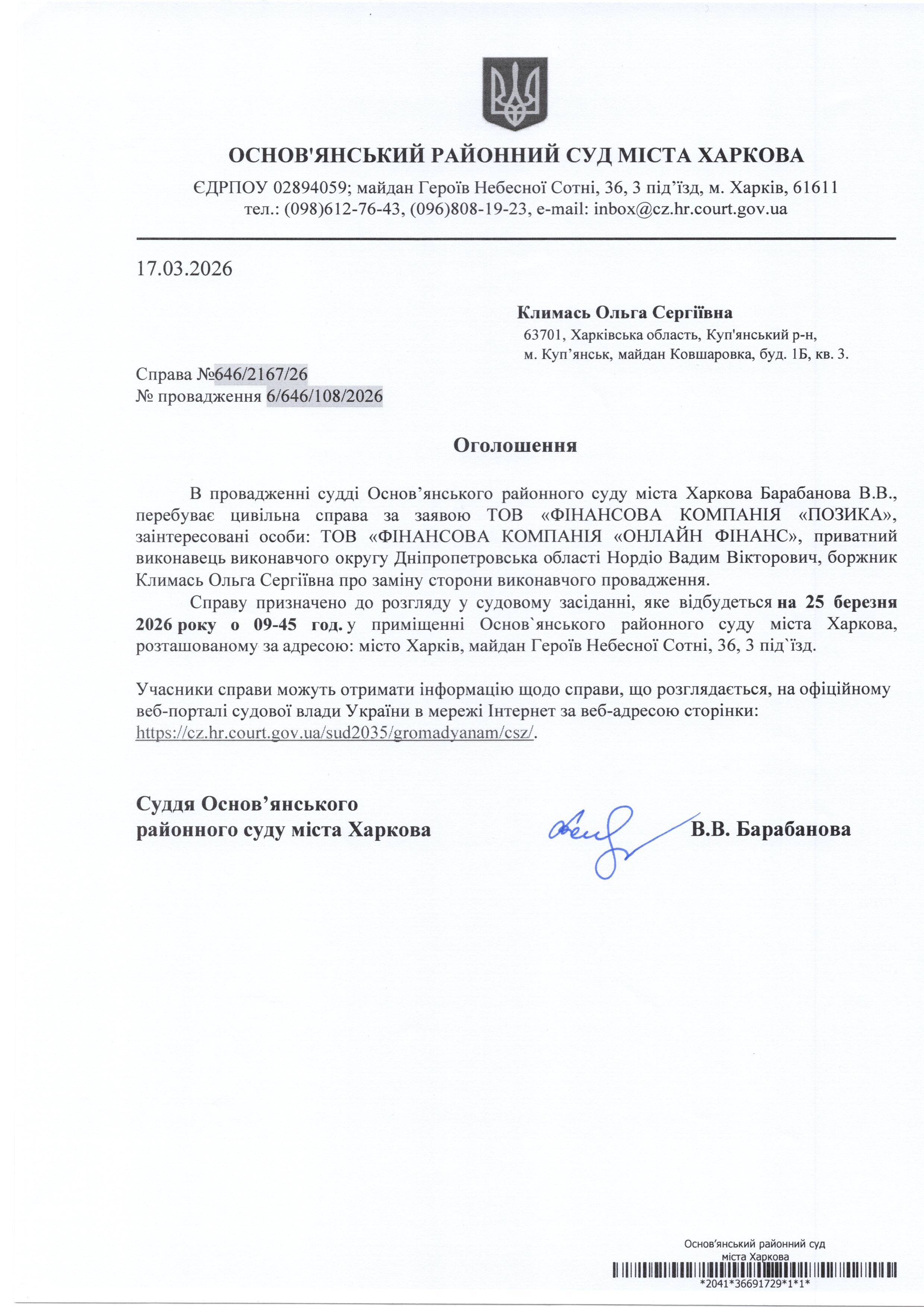 Оголошення по справі № 646/2167/26 для Климась Ольги Сергіївни