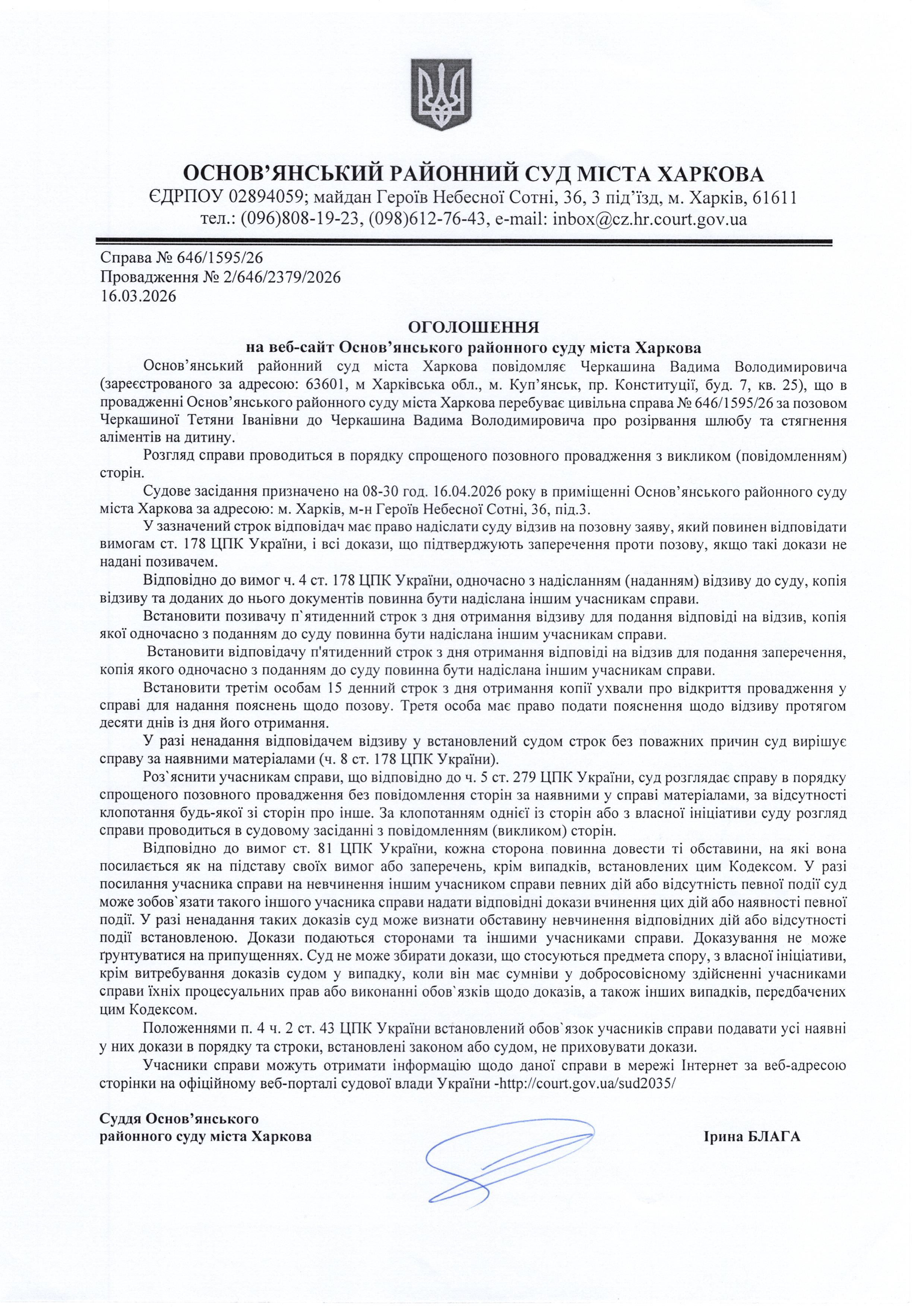 Оголошення по справі № 646/1595/26 для Черкашина Вадима Володимировича