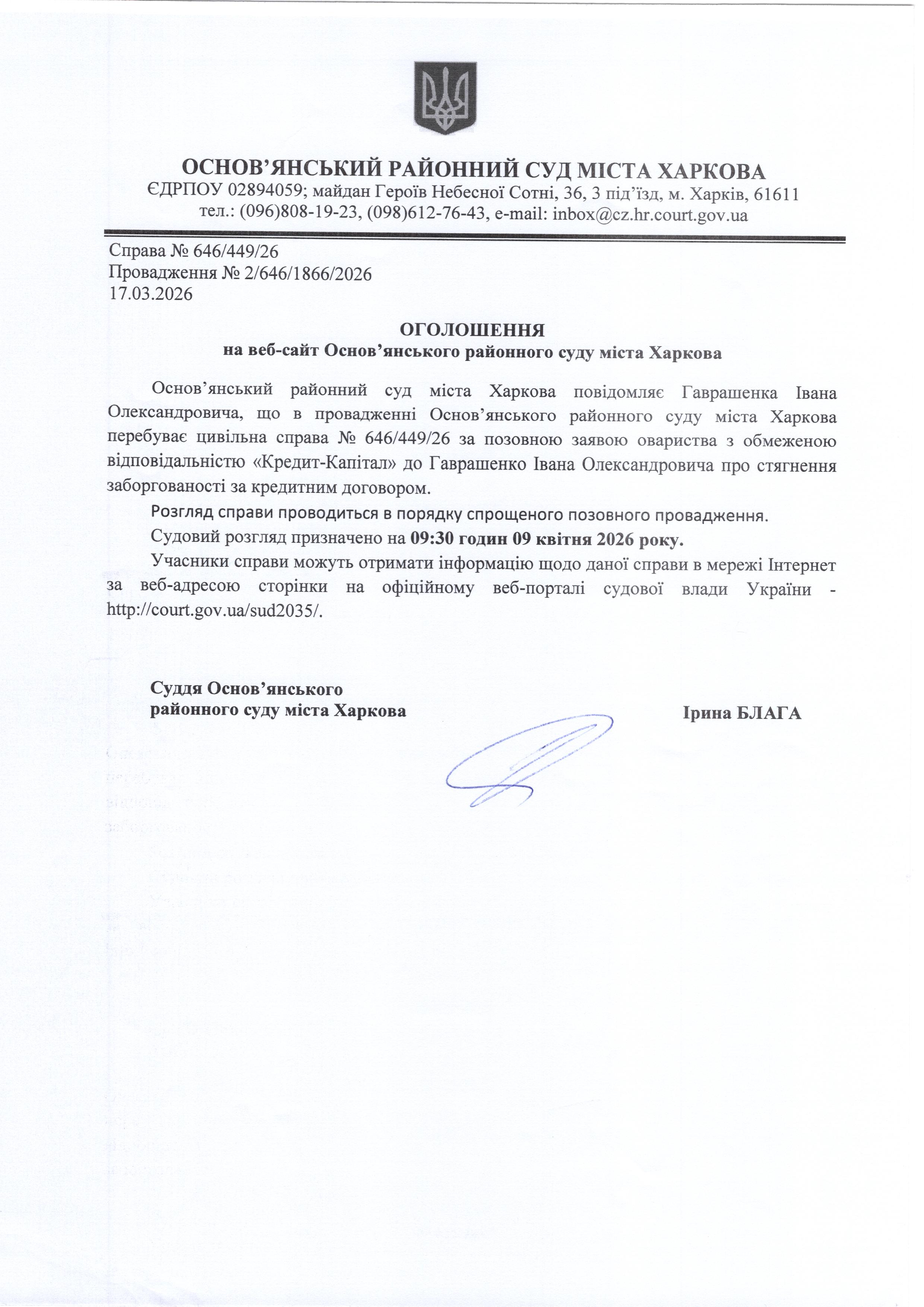 Оголошення по справі № 646/449/26 для Гаврашенка Івана Олександровича
