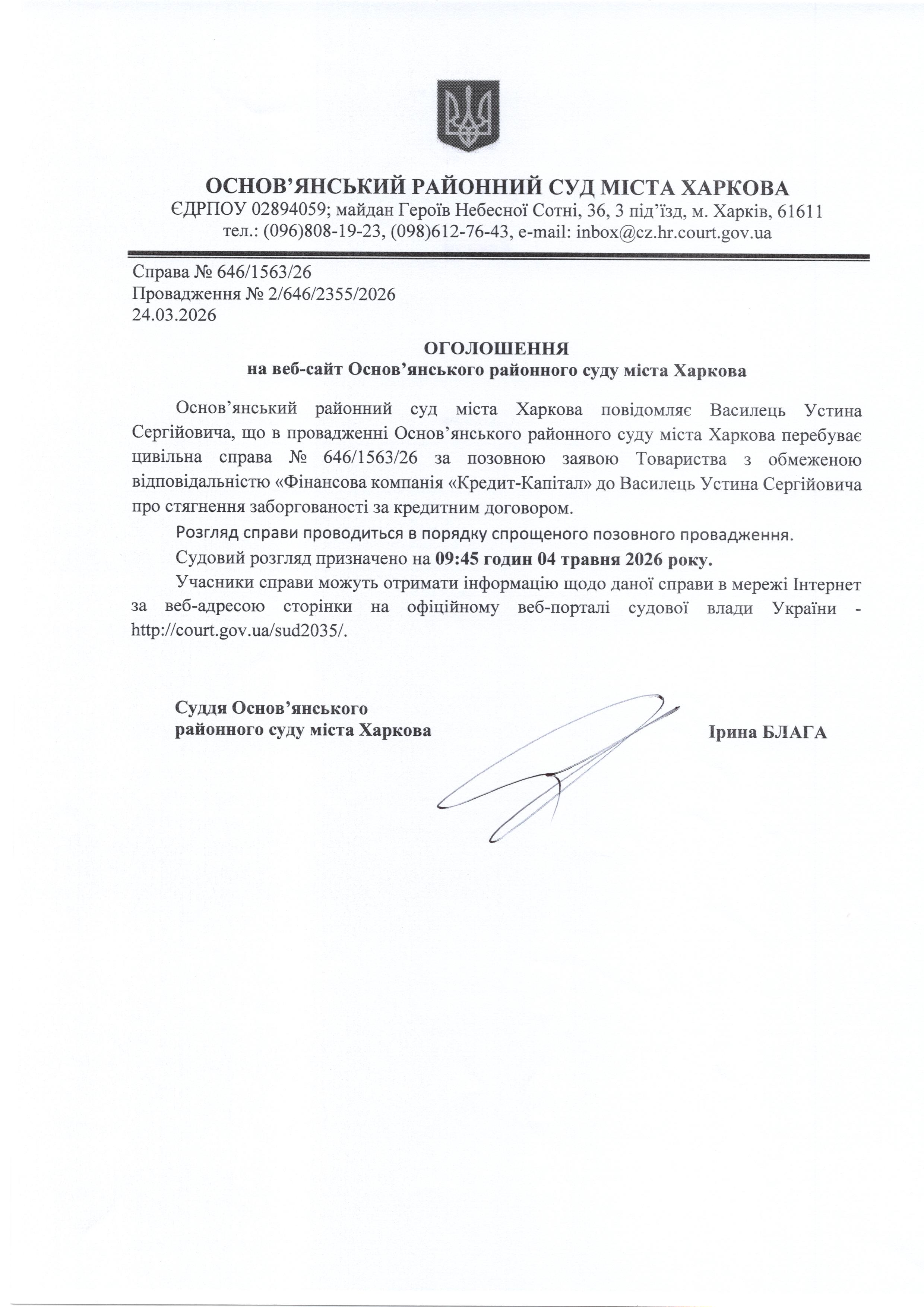 Оголошення по справі № 646/1563/26 для Василець Устина Сергійовича
