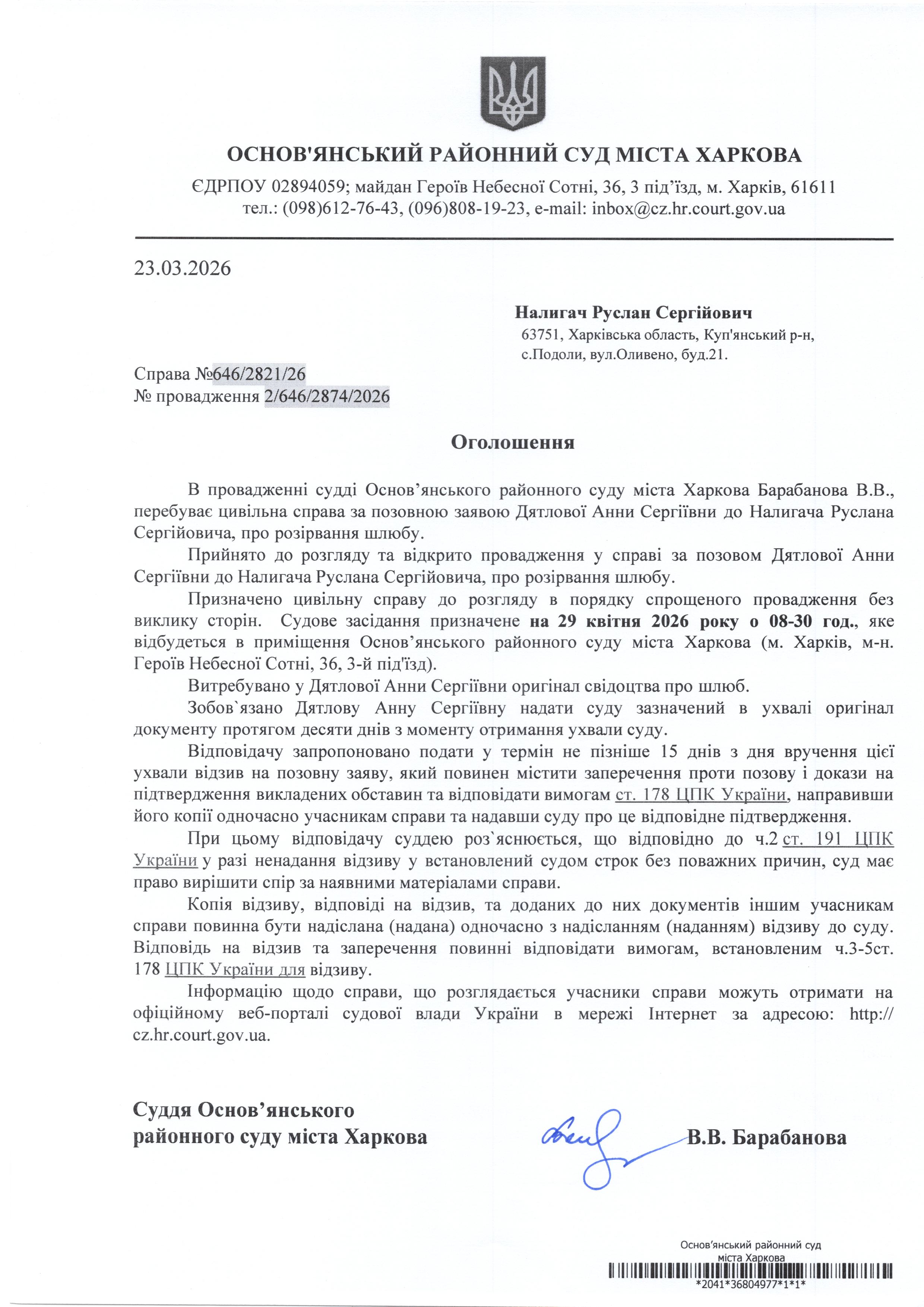 Оголошення по справі № 646/2821/26 для Налигач Руслана Сергійовича