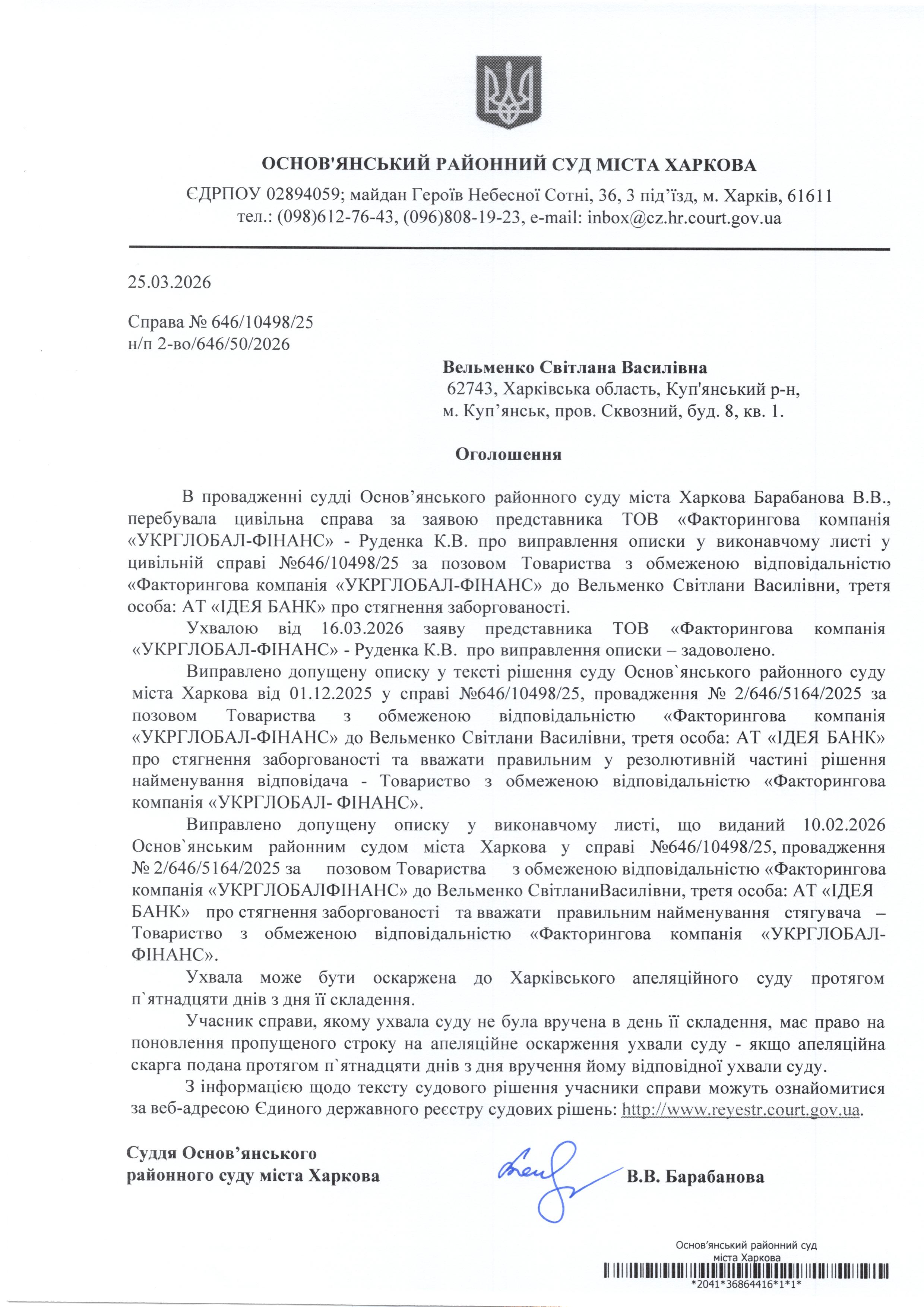Оголошення по справі № 646/10498/25 для Вельменко Світлани Василівни