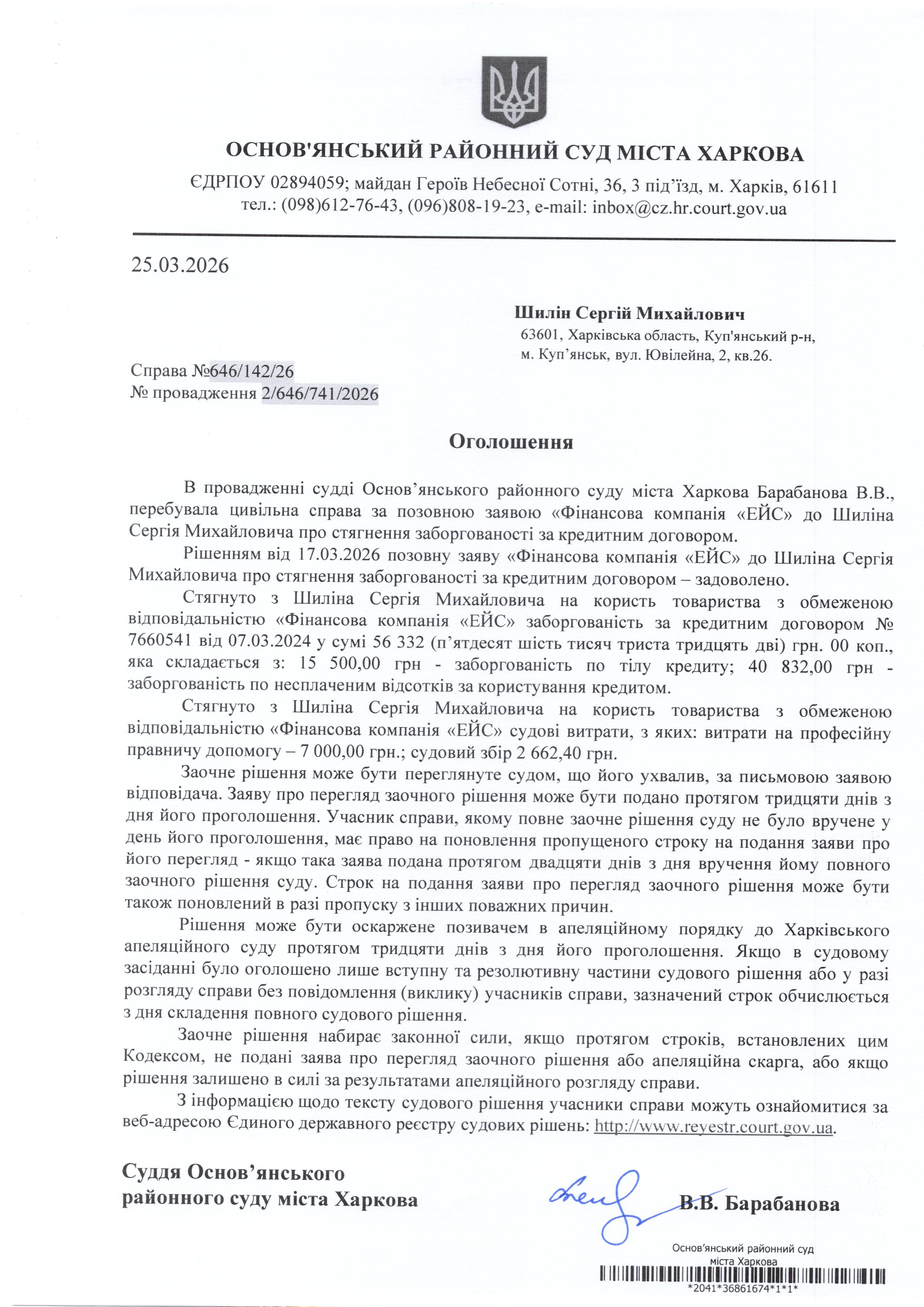 Оголошення по справі № 646/142/26 для Шиліна Сергія Михайловича