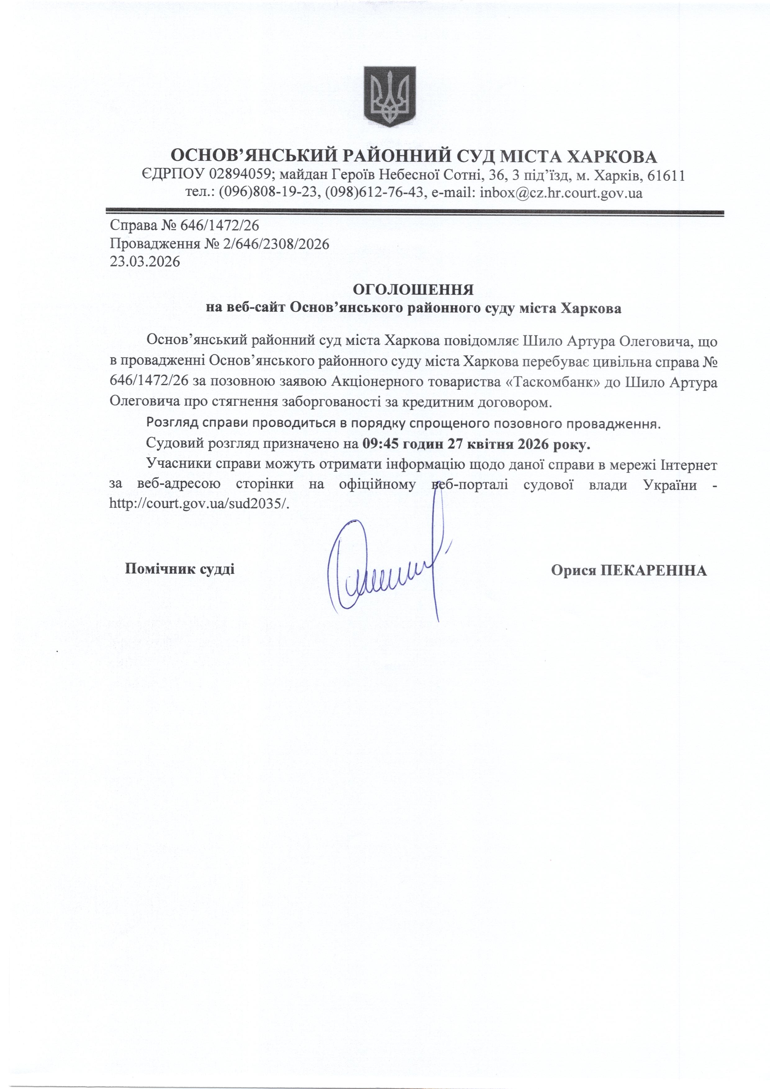 Оголошення по справі № 646/1472/26 для Шило Артура Олеговича