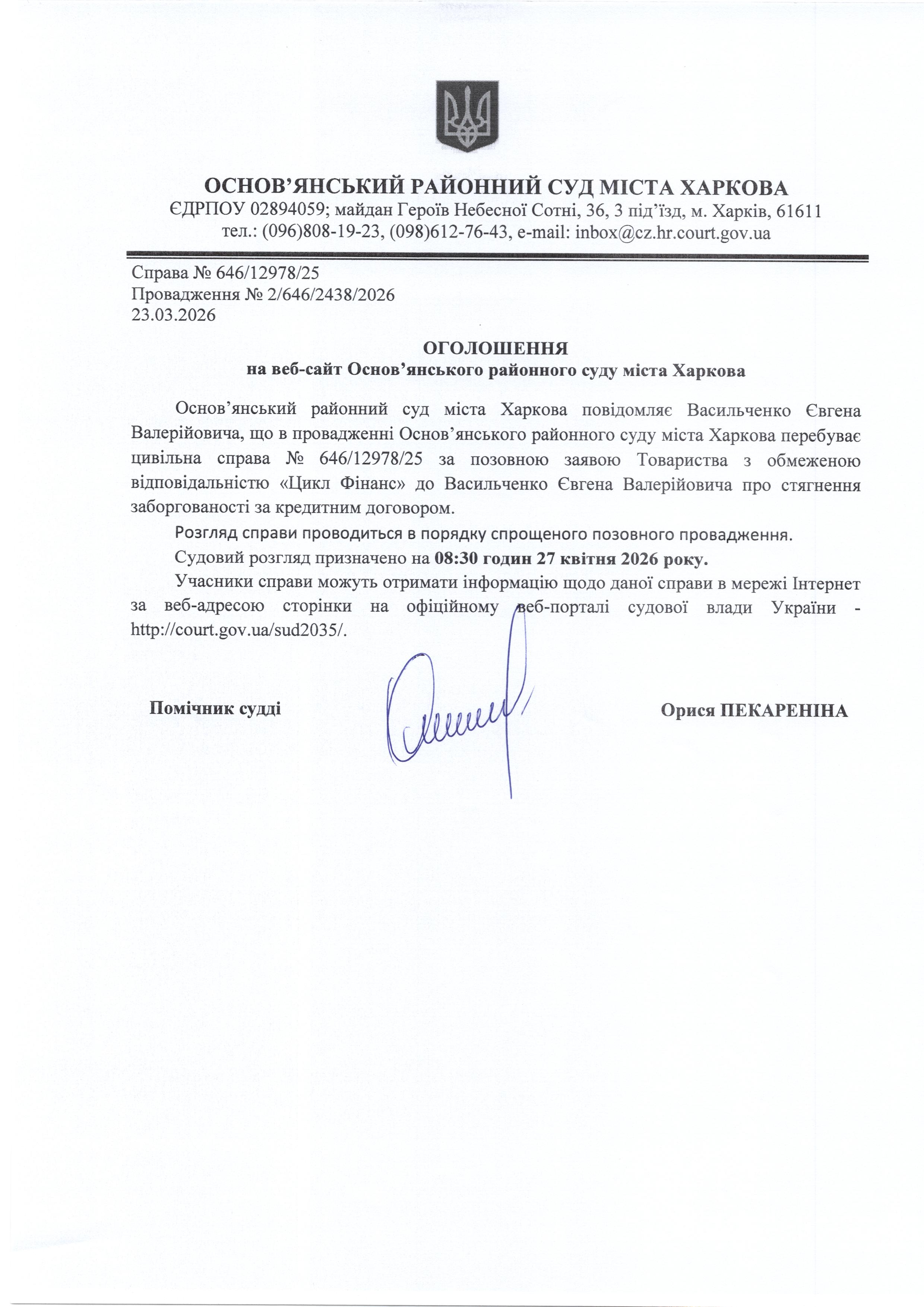 Оголошення по справі № 646/12978/25 для Васильченка Євгена Валерійовича