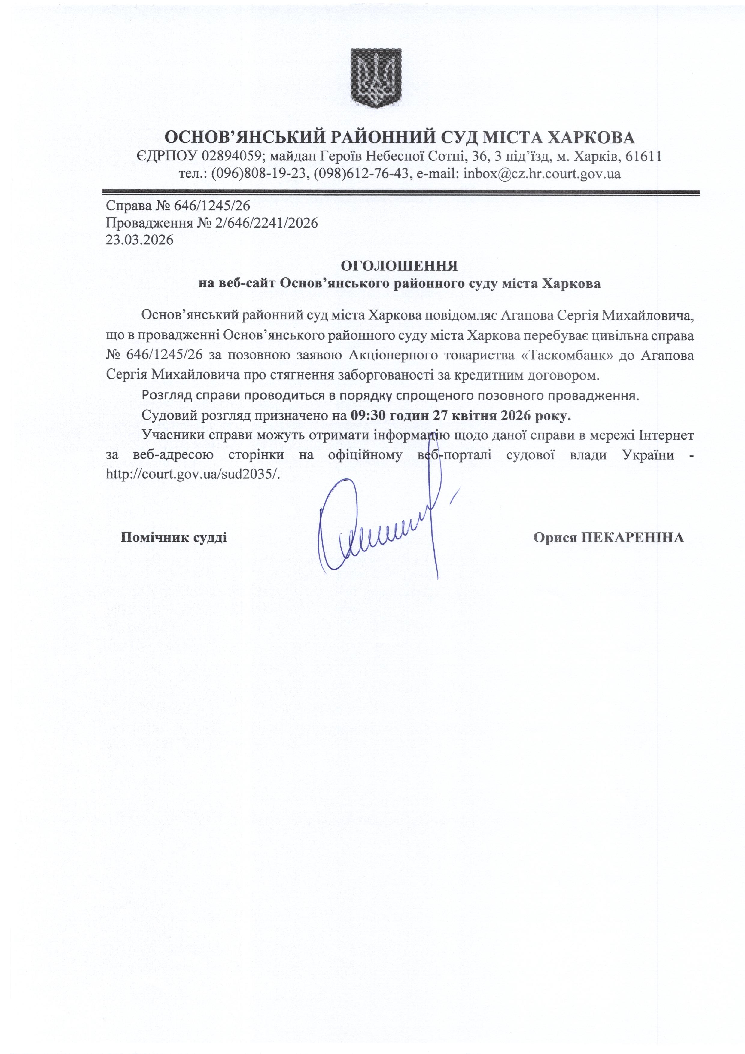 Оголошення по справі № 646/1245/26 для Агапова Сергія Михайловича