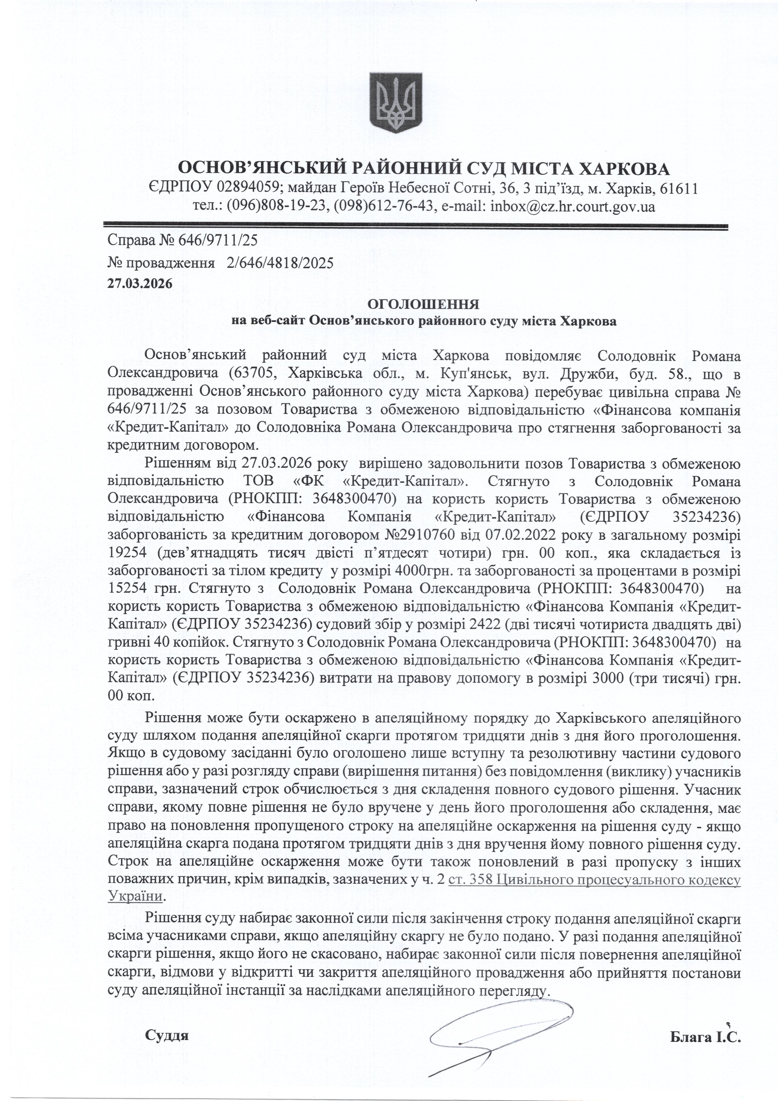 Оголошення по справі № 646/9711/25 для Солодовніка Романа Олександровича