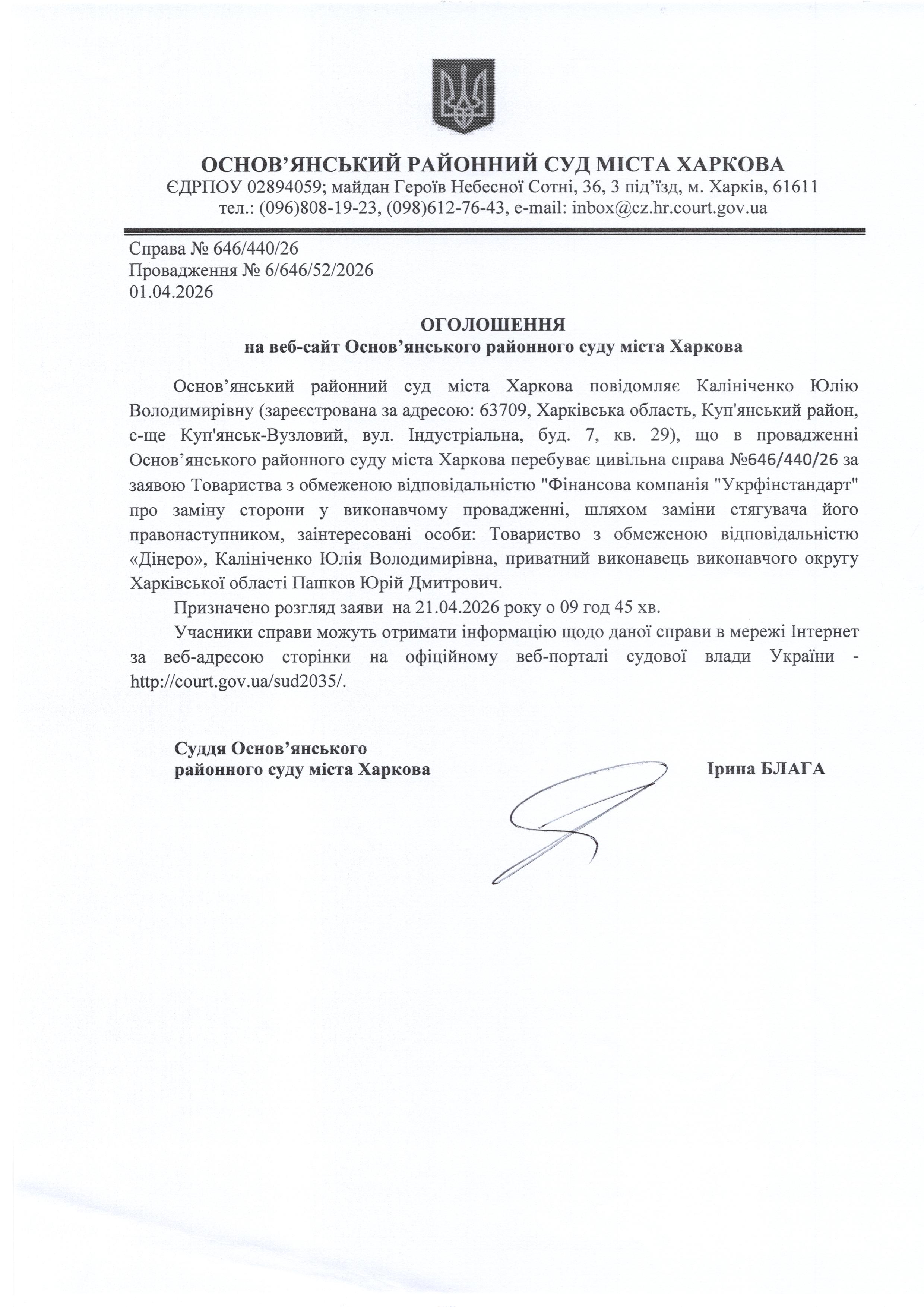 Оголошення по справі № 646/440/26 для Калініченко Юлії Володимирівни