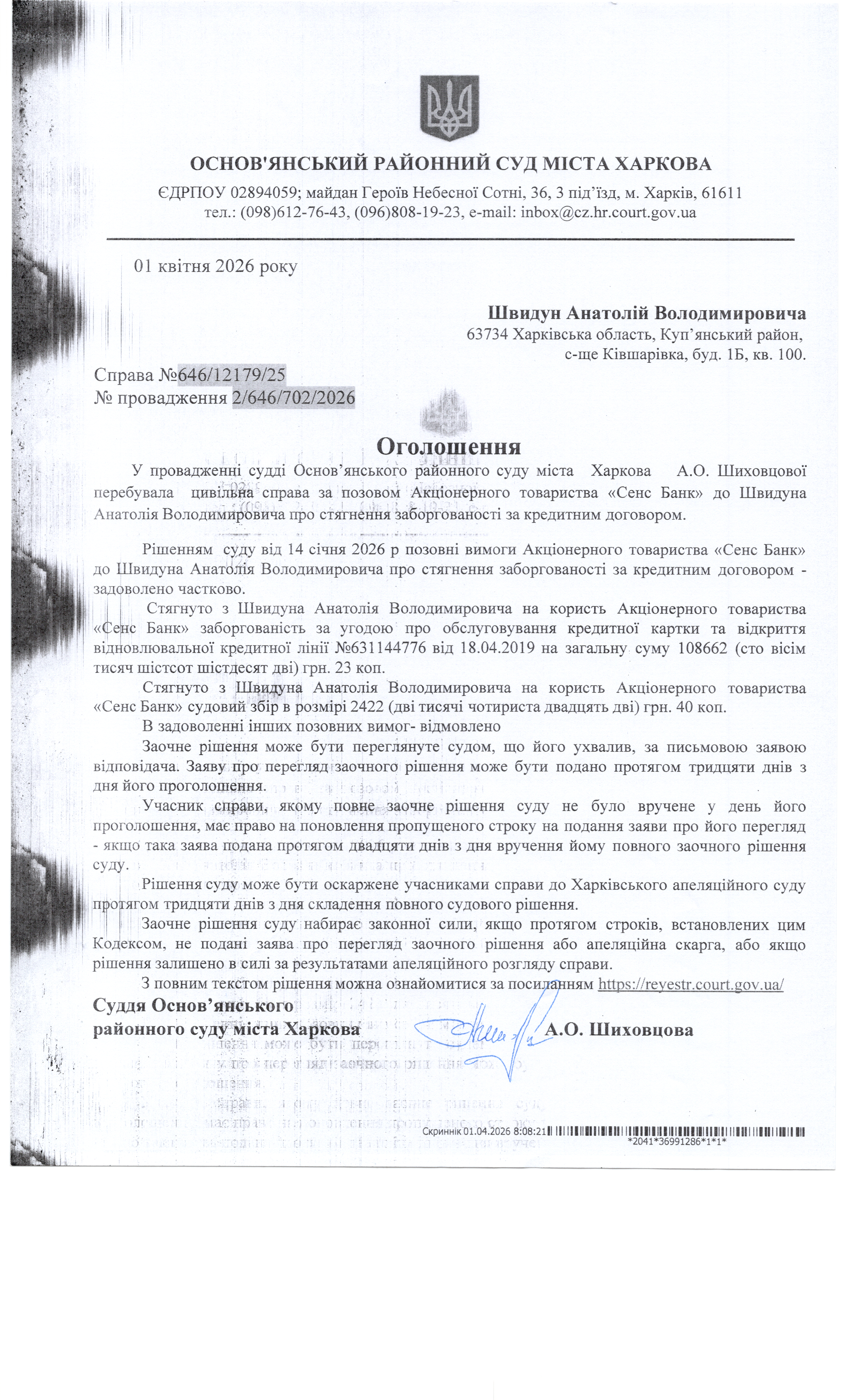 Оголошення по справі № 646/12179/25 для Швидуна Анатолія Володимировича