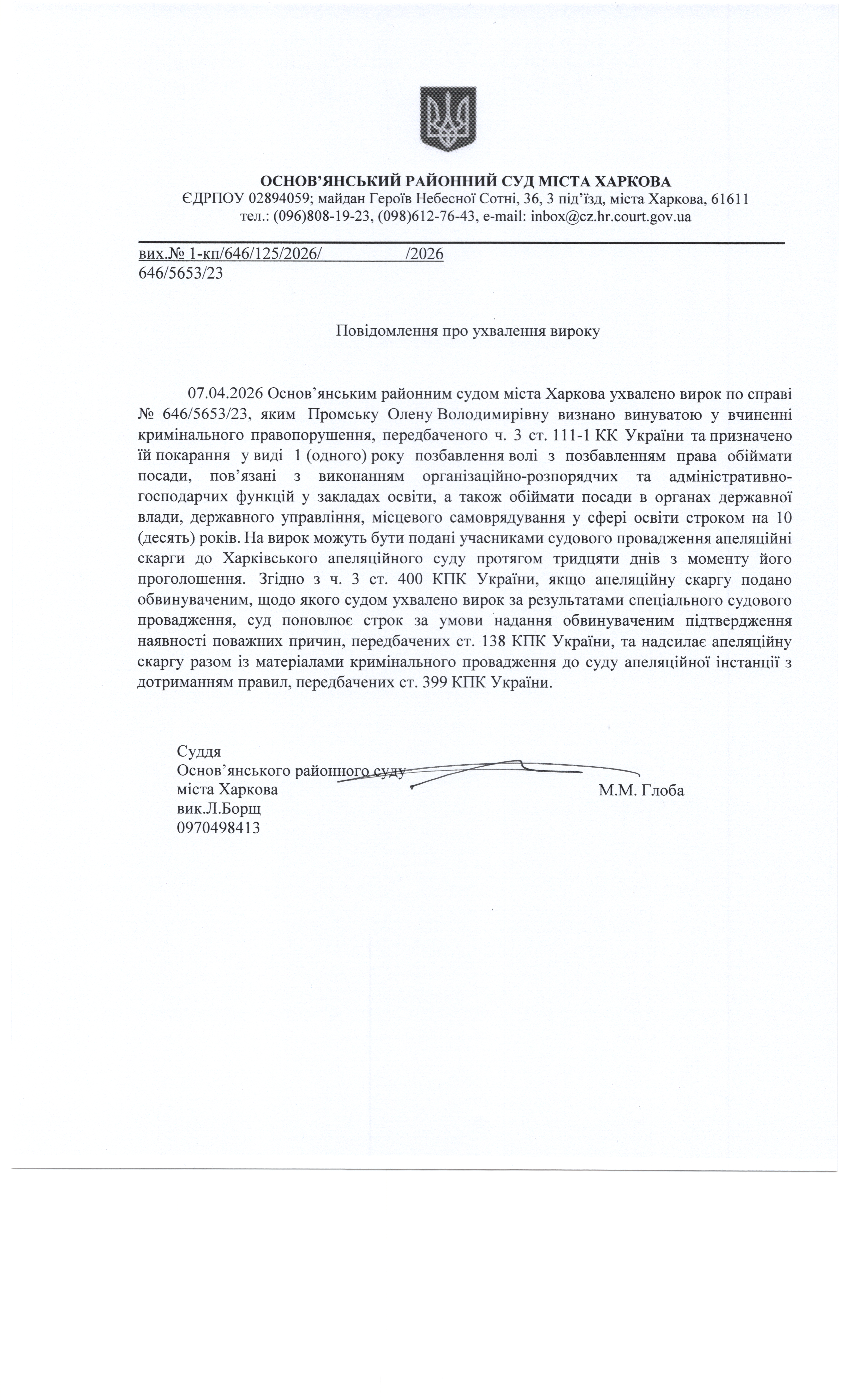 Повідомлення про ухвалення вироку щодо Промської Олени Володимирівни по справі № 646/5653/23
