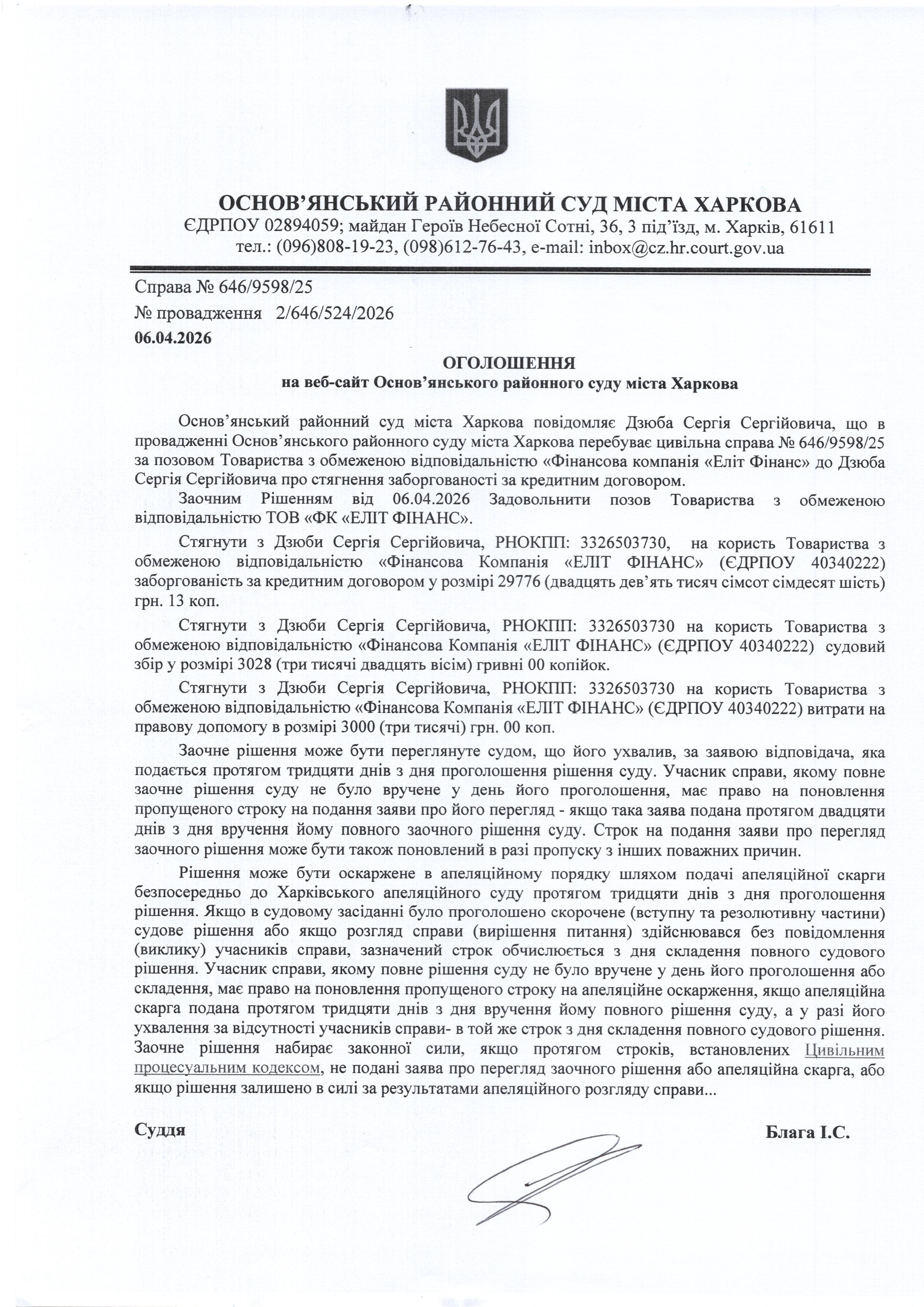 Оголошення по справі № 646/9598/25 для Дзюби Сергія Сергійовича