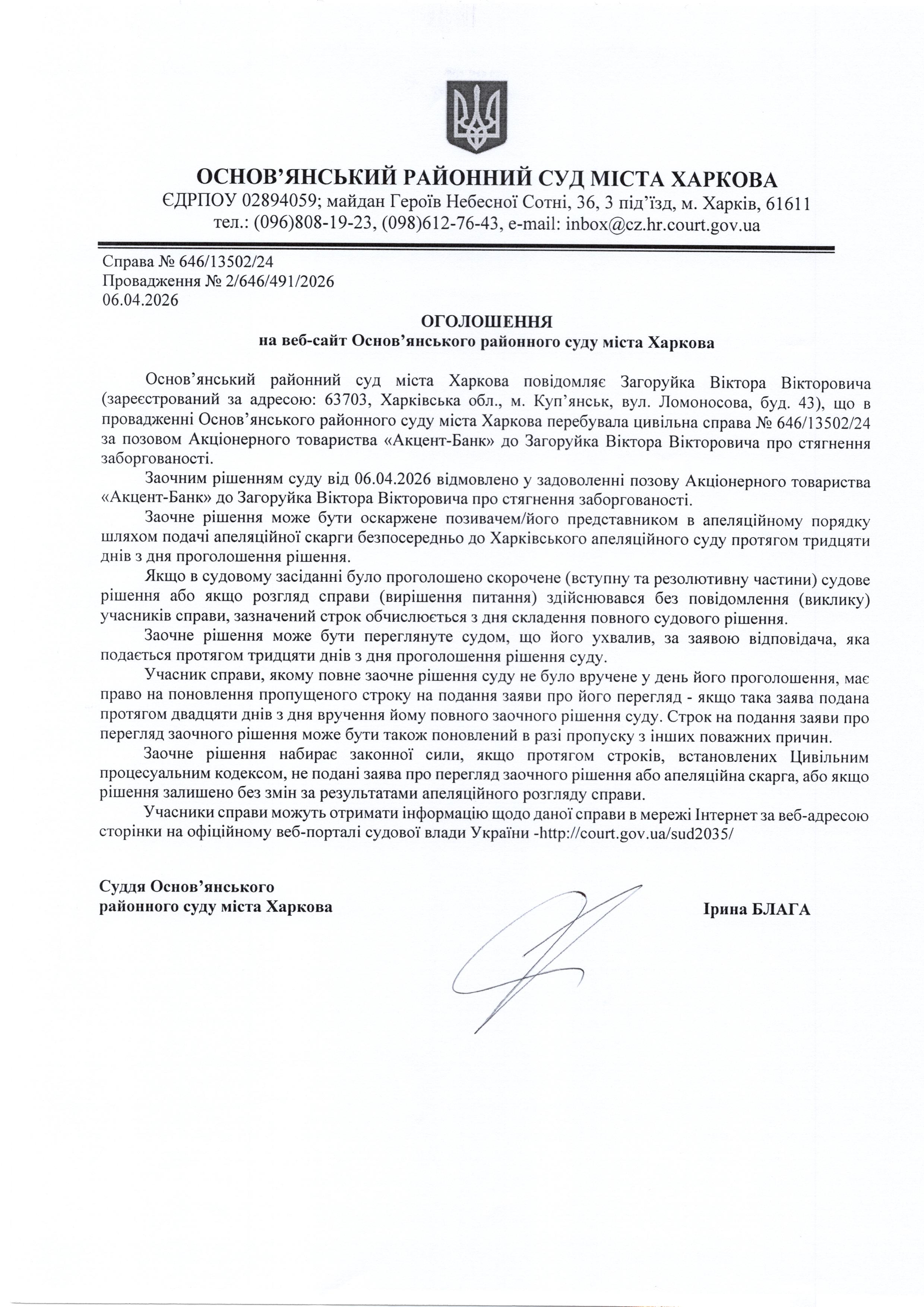 Оголошення по справі № 646/13502/24 для Загоруйка Віктора Вікторовича