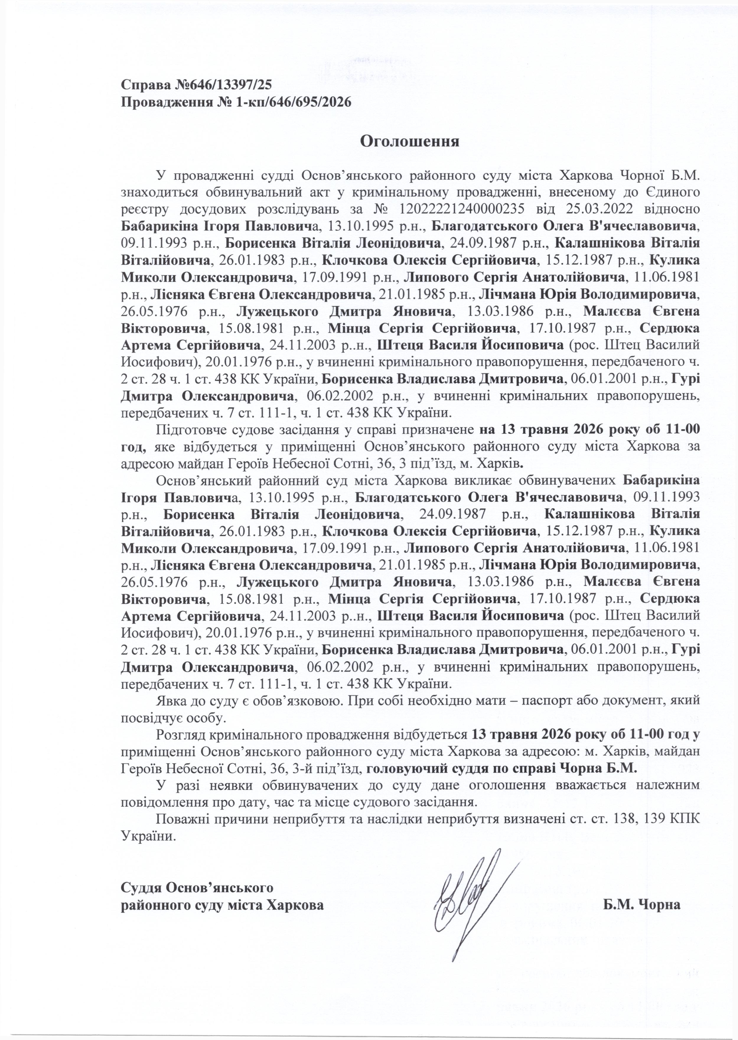 Оголошення по справі № 646/13397/25 про призначення підготовчого судового засідання