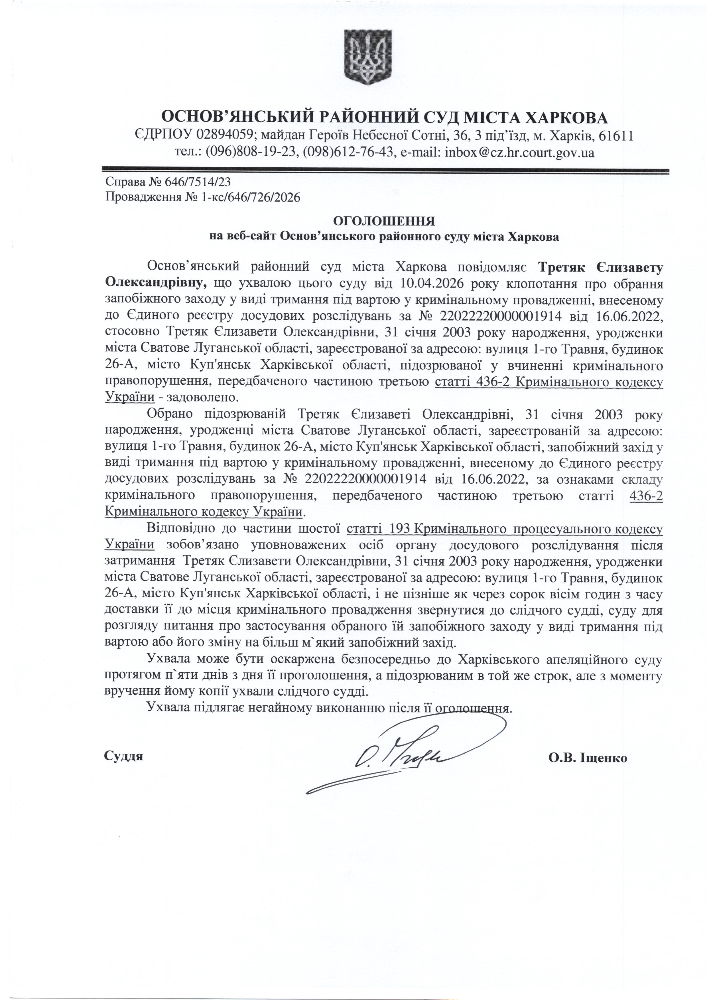 Оголошення по справі № 646/7514/23 для Третяк Єлизавети Олександрівни