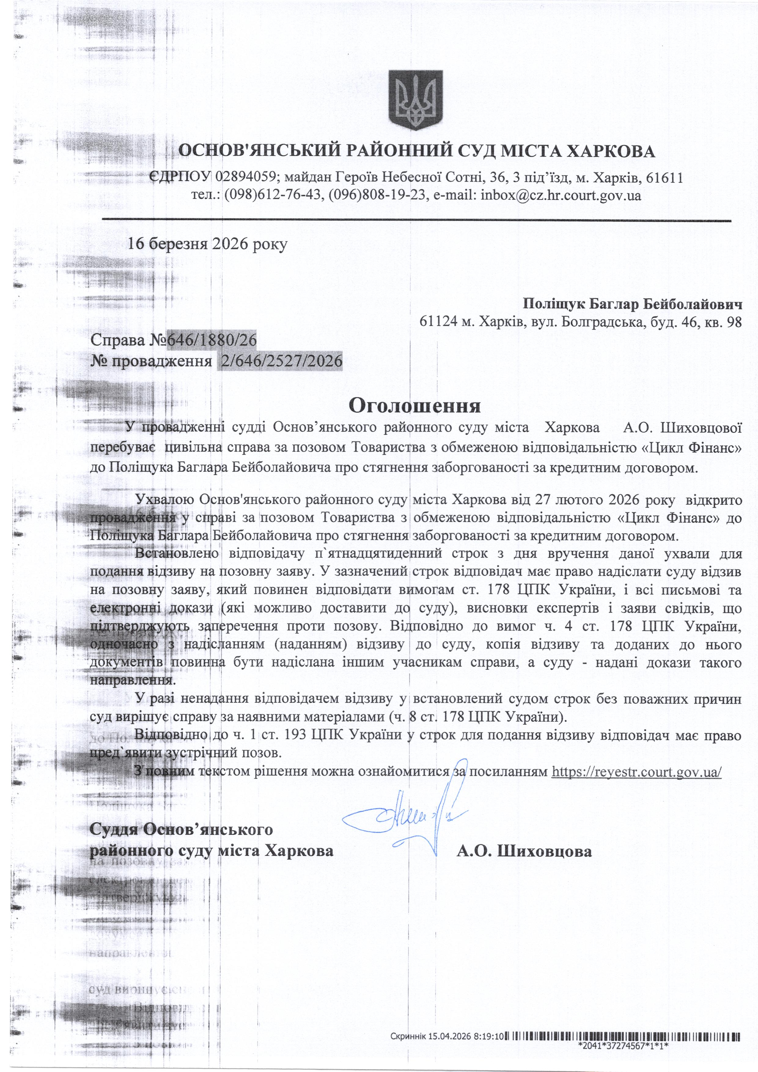 Оголошення по справі № 646/1880/26 для Поліщук Баглара Бейболайовича