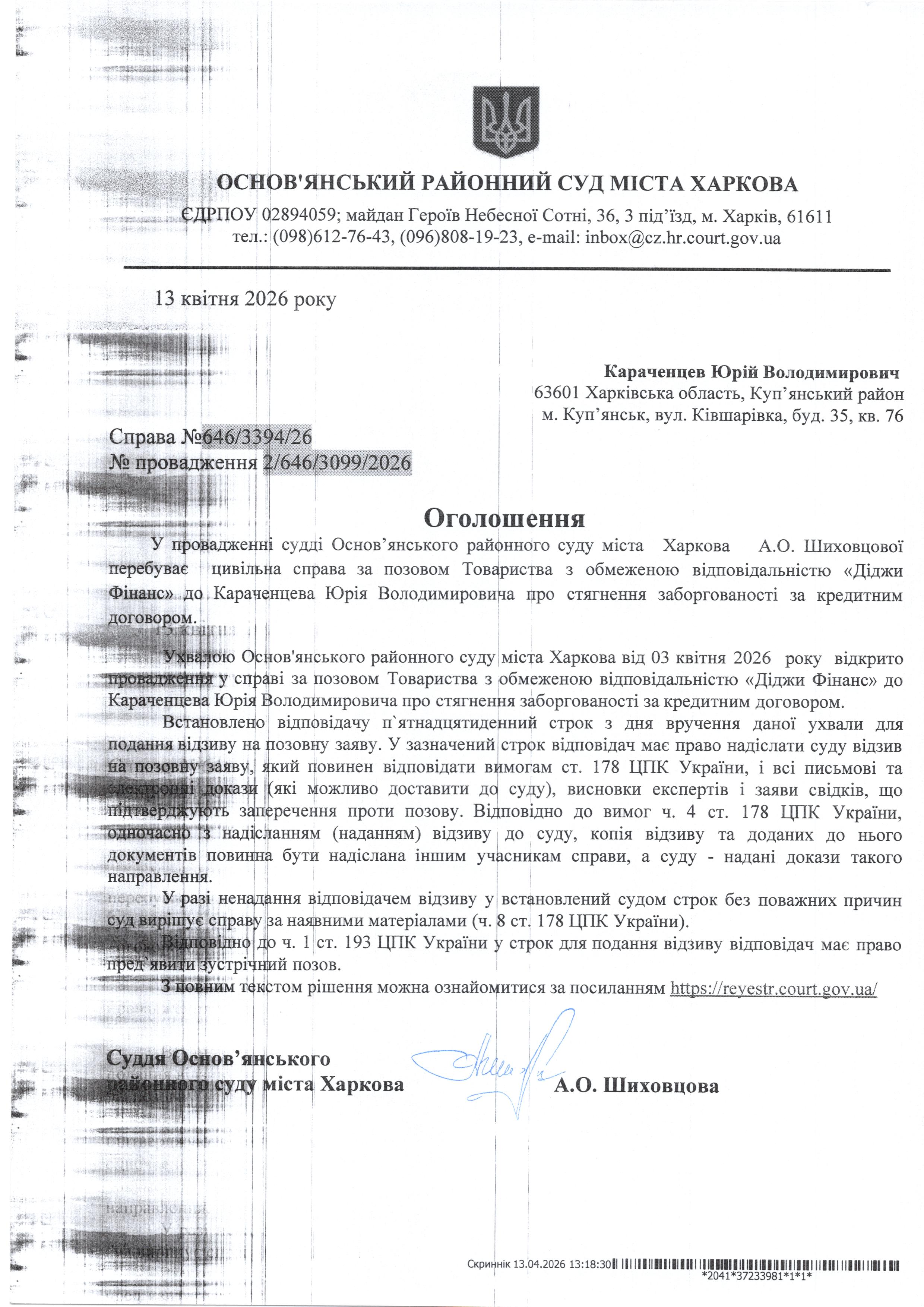Оголошення по справі № 646/3394/26 для Караченцева Юрія Володимировича