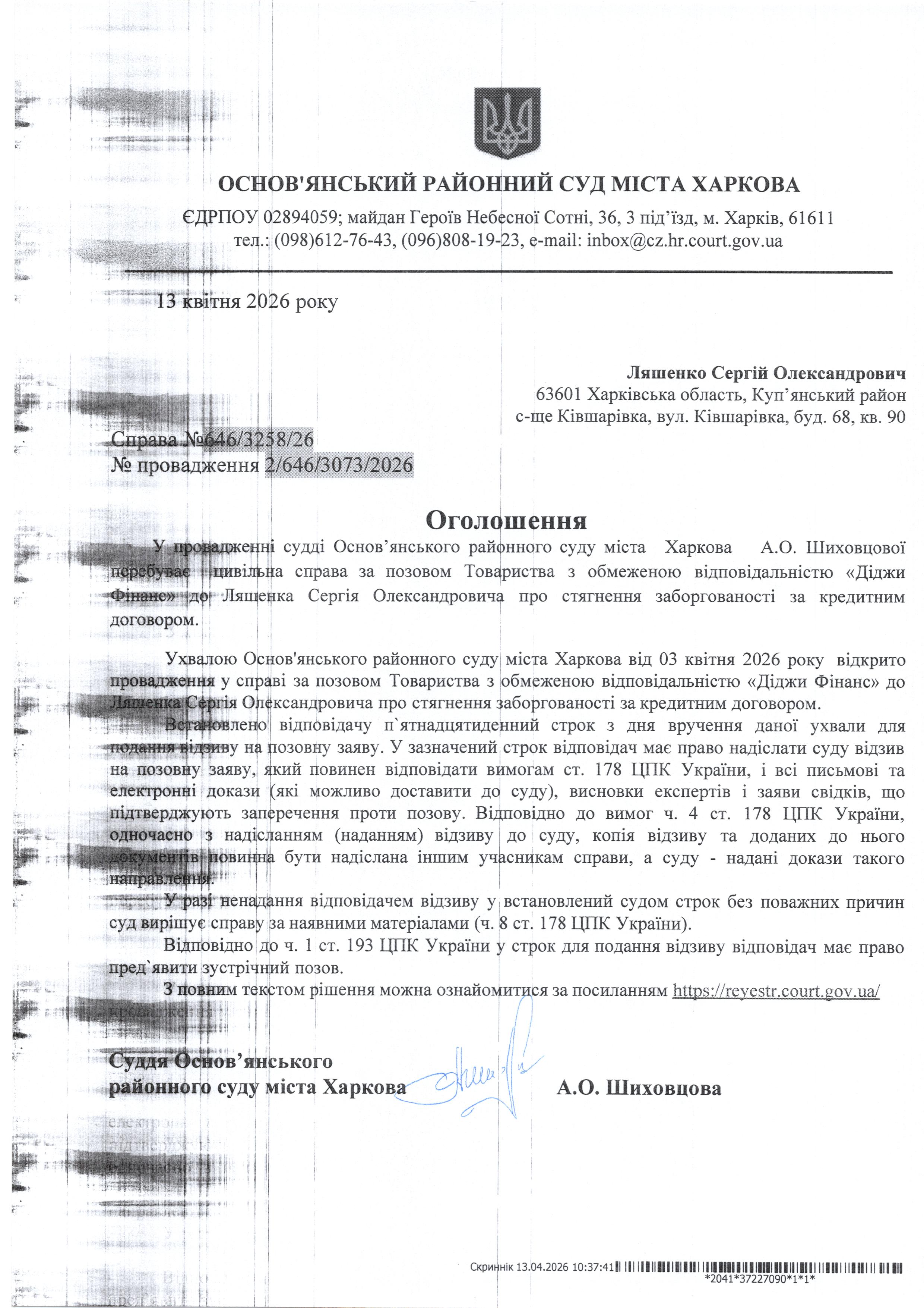 Оголошення по справі № 646/3258/26 для Ляшенка Сергія Олександровича