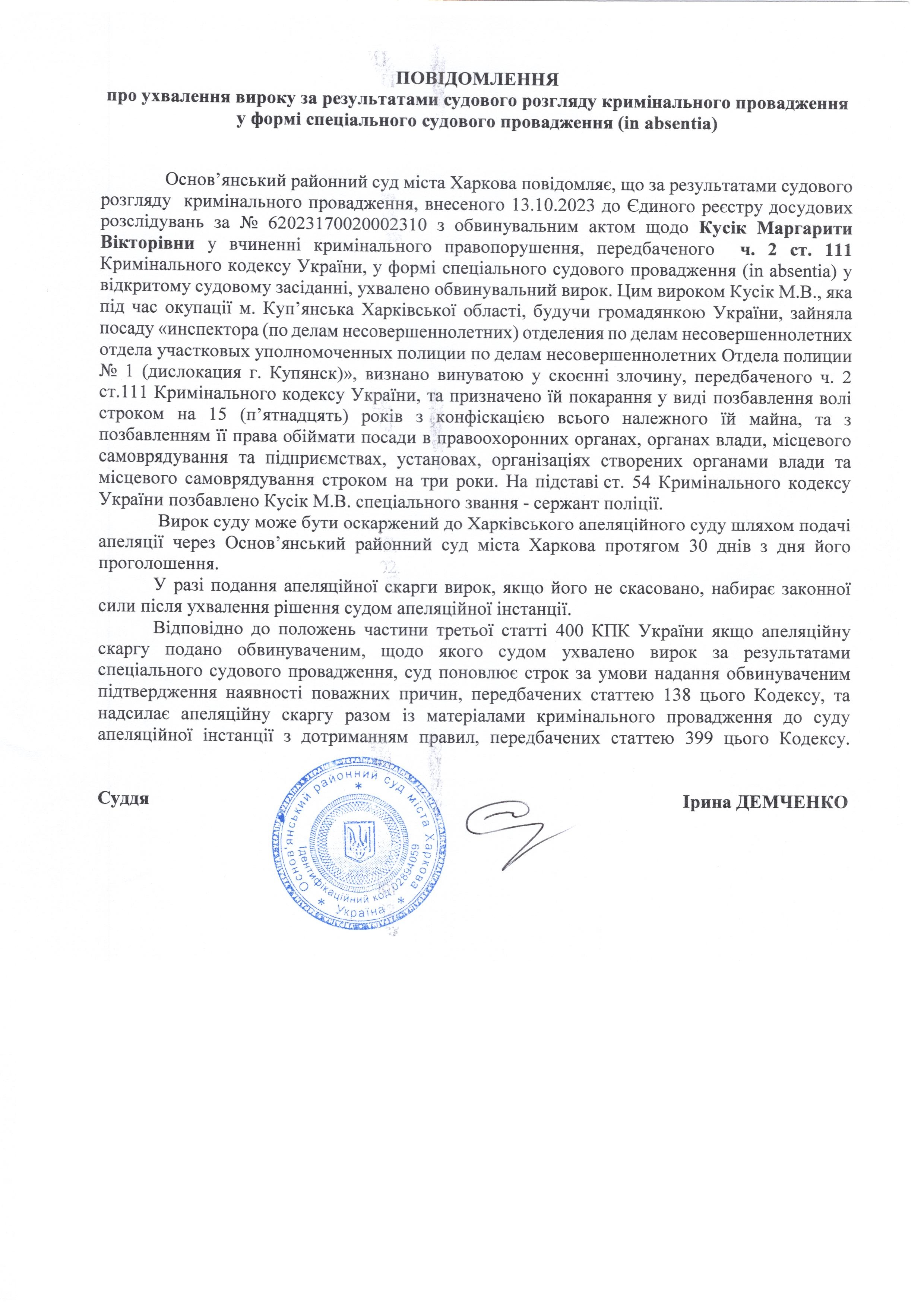 Повідомлення про ухвалення вироку за результатими судовий розгляд кримінального провадження щодо Кусік Маргарити Вікторівни у формі спеціального судового провадження (in absentia)