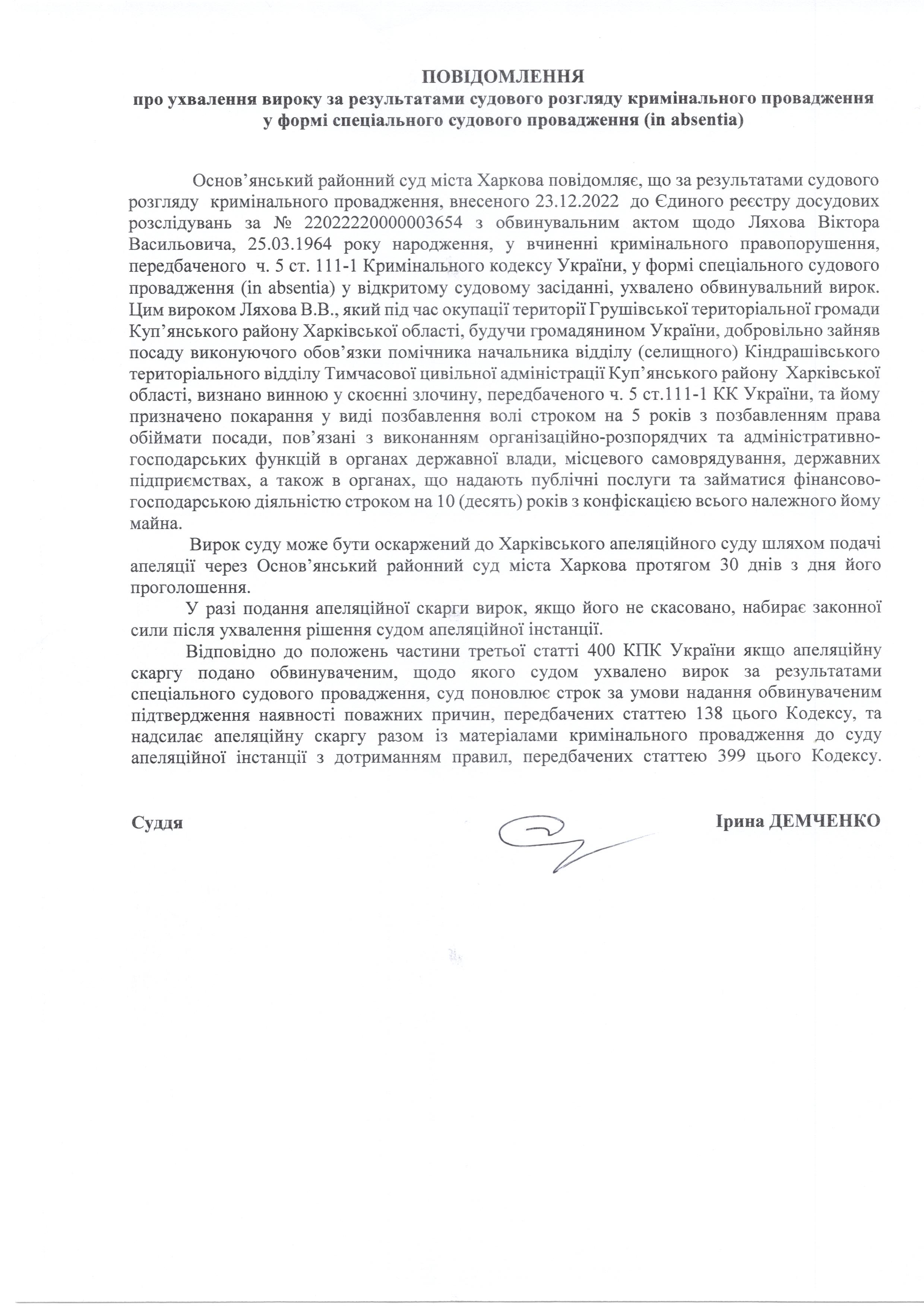 Повідомлення про ухвалення вироку за результатими судовий розгляд кримінального провадження щодо Ляхова Віктора Васильовича у формі спеціального судового провадження (in absentia)