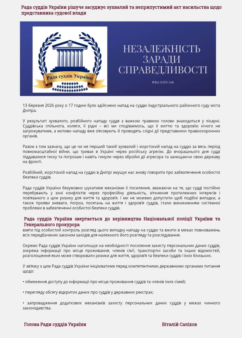 Безумовно, у суспільстві існує критика окремих рішень і дій деяких суддів, і частина цієї критики може бути обґрунтованою. Але важливо розрізняти критику судових рішень і атмосферу, в якій суддя може стати мішенню для фізичного насильства, погроз чи переслідувань.