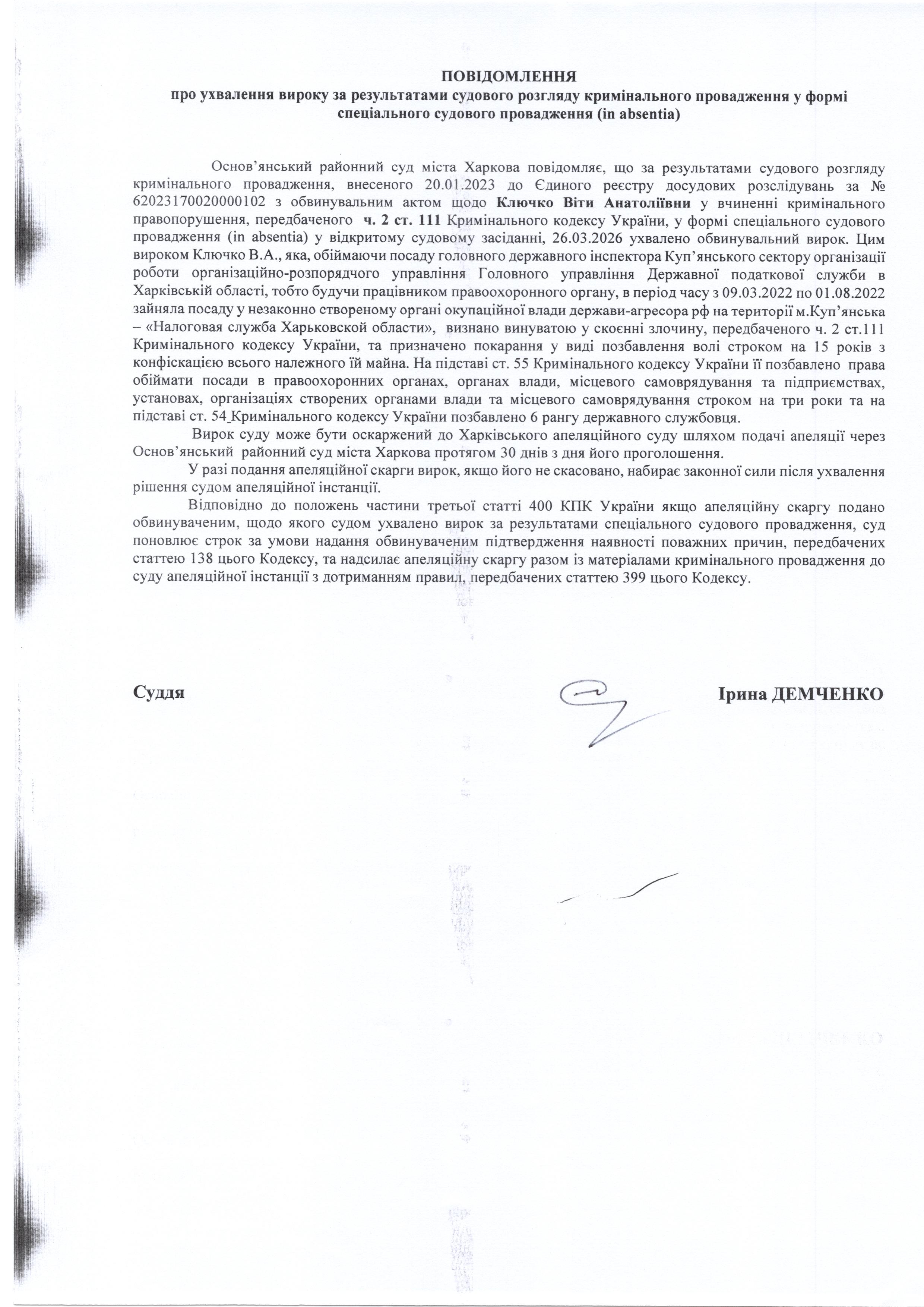 Повідомлення про ухвалення вироку за результатими судовий розгляд кримінального провадження щодо Ключко Віти Анатоліївни у формі спеціального судового провадження (in absentia)